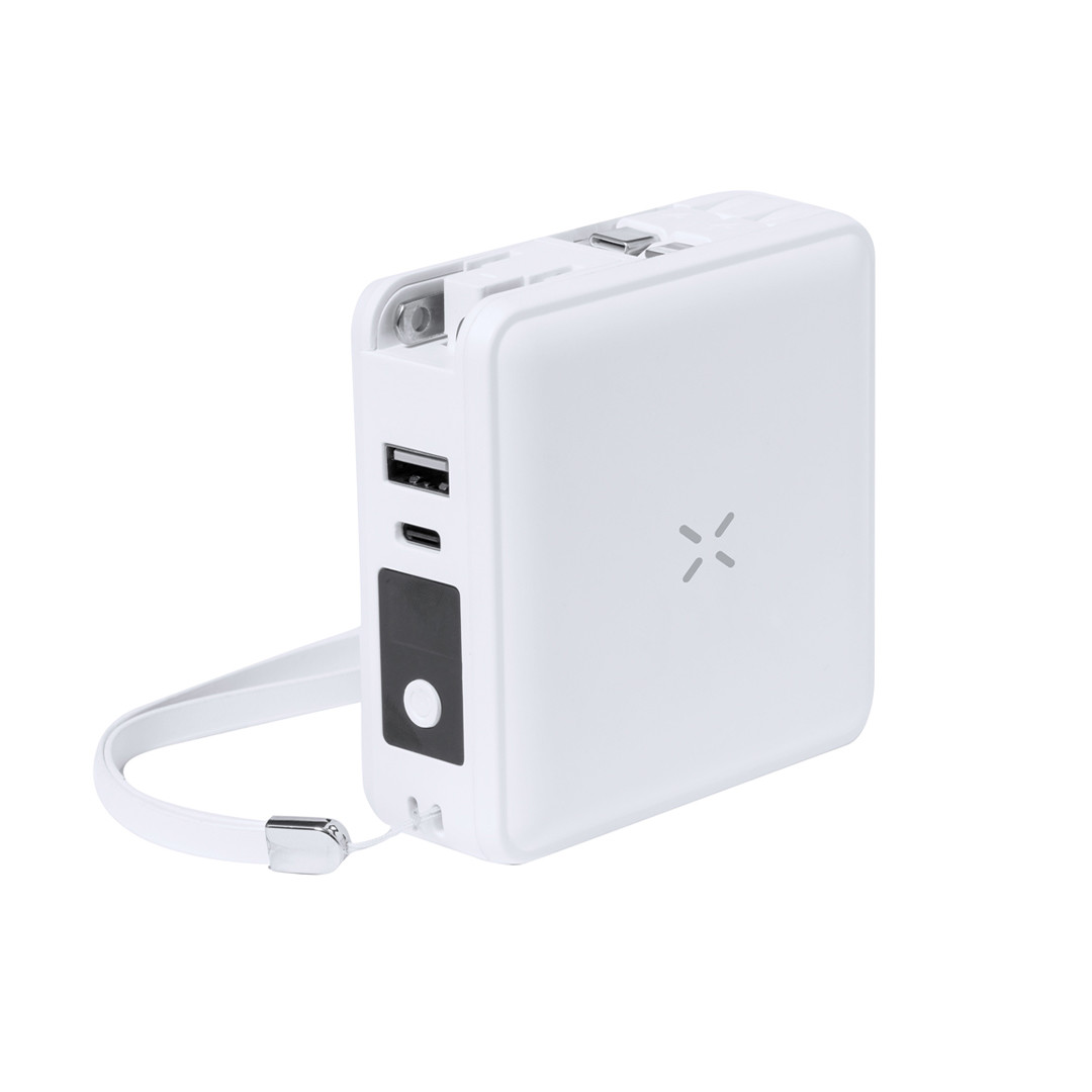 Adaptador viaje inalámbrico, multifunción y multisalida con powerbank integrado de 10.000 mAh de capacidad de carga. De elegante diseño en color blanco y amplia superficie de marcaje. Función de carga inalámbrica con tecnología magsafe, conexión dual de entrada y salida de corriente Tipo C y salidas USB. Con dos cables de salida integrados con conectores Tipo C y 2 en 1 (Micro USB y Lightning). Simultaneidad de uso para todas las funciones, con adaptadores de enchufe de pared para USA, Europa, Asia, Reino Unido y Australia. Presentado en atractiva caja de diseño kraft. Disponible manual de instrucciones en español e inglés.Las capacidades mostradas en todas nuestras baterías auxiliares externas son reales, incorporando todas ellas baterías de grado A y no recicladas, con una vida útil de al menos 500 ciclos de carga y según normativa CE.Además, están fabricadas conforme a los estándares RoHS y en cumplimiento con los siguientes requisitos de seguridad:Sistema de protección contra sobre