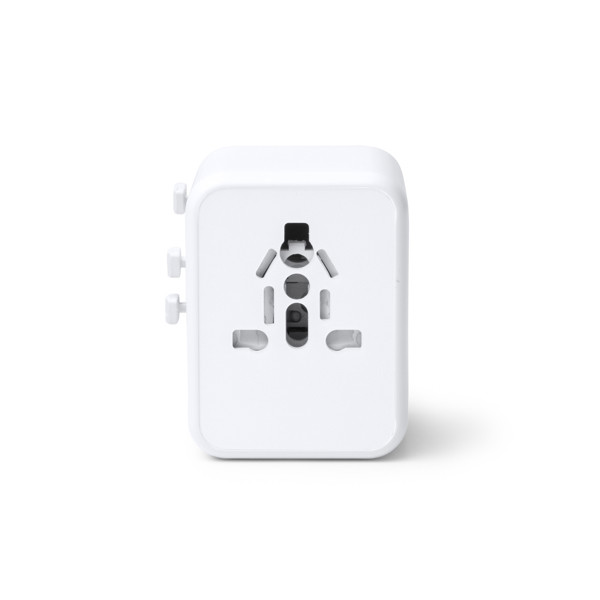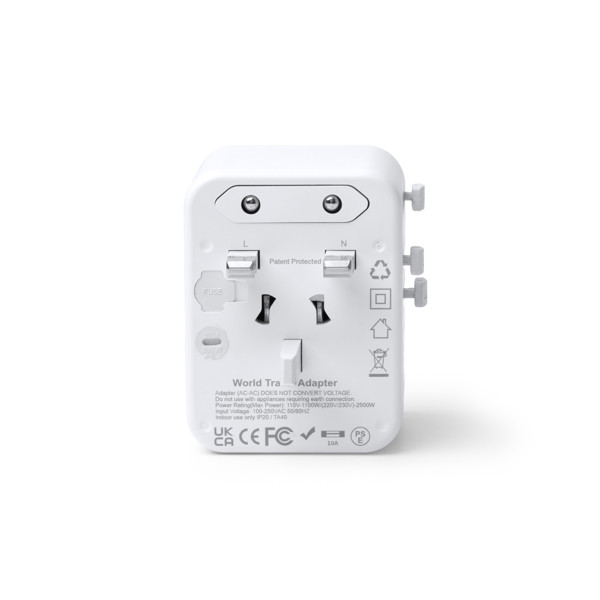 Adaptador de enchufes para viajes. Elaborado en policarbonato de alta calidad con una potencia de 20W y carga rápida. Cuenta con dos salidas USB y dos Tipo C. Es válido para usarse en Europa, Reino Unido, Estados Unidos, Asia y Australia.