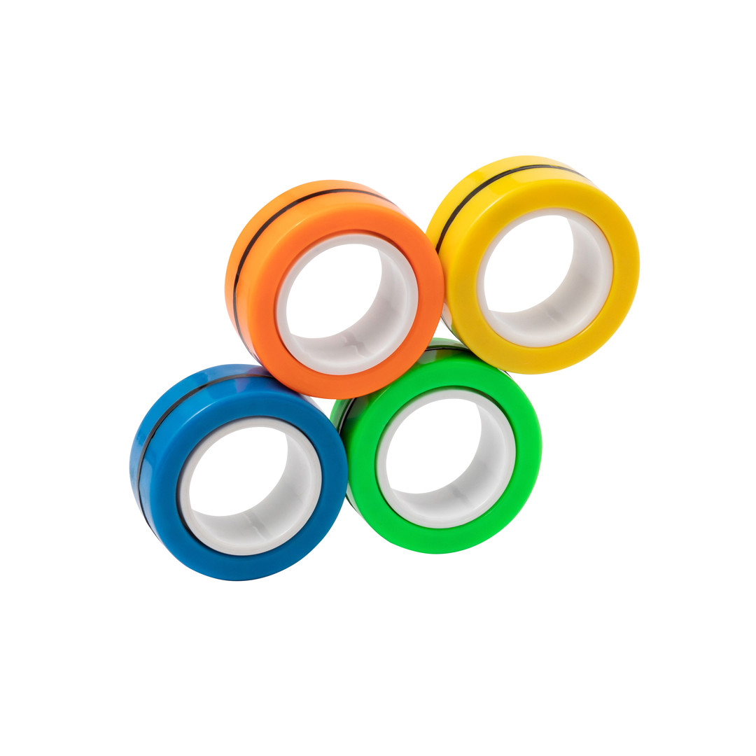 Original antiestrés en forma de anillos. Cuenta con cuatro piezas de colores con imanes para poder juntar y separar tantas veces como se quiera, liberando tensión gracias a su característico movimiento circular. Además, ofrecen la posibilidad de usarlos como spinner, ya sea juntos o por separado. Presentado individualmente en bolsa reciclada de RPET. 4 Piezas. Magnético. Funda Poliéster RPET