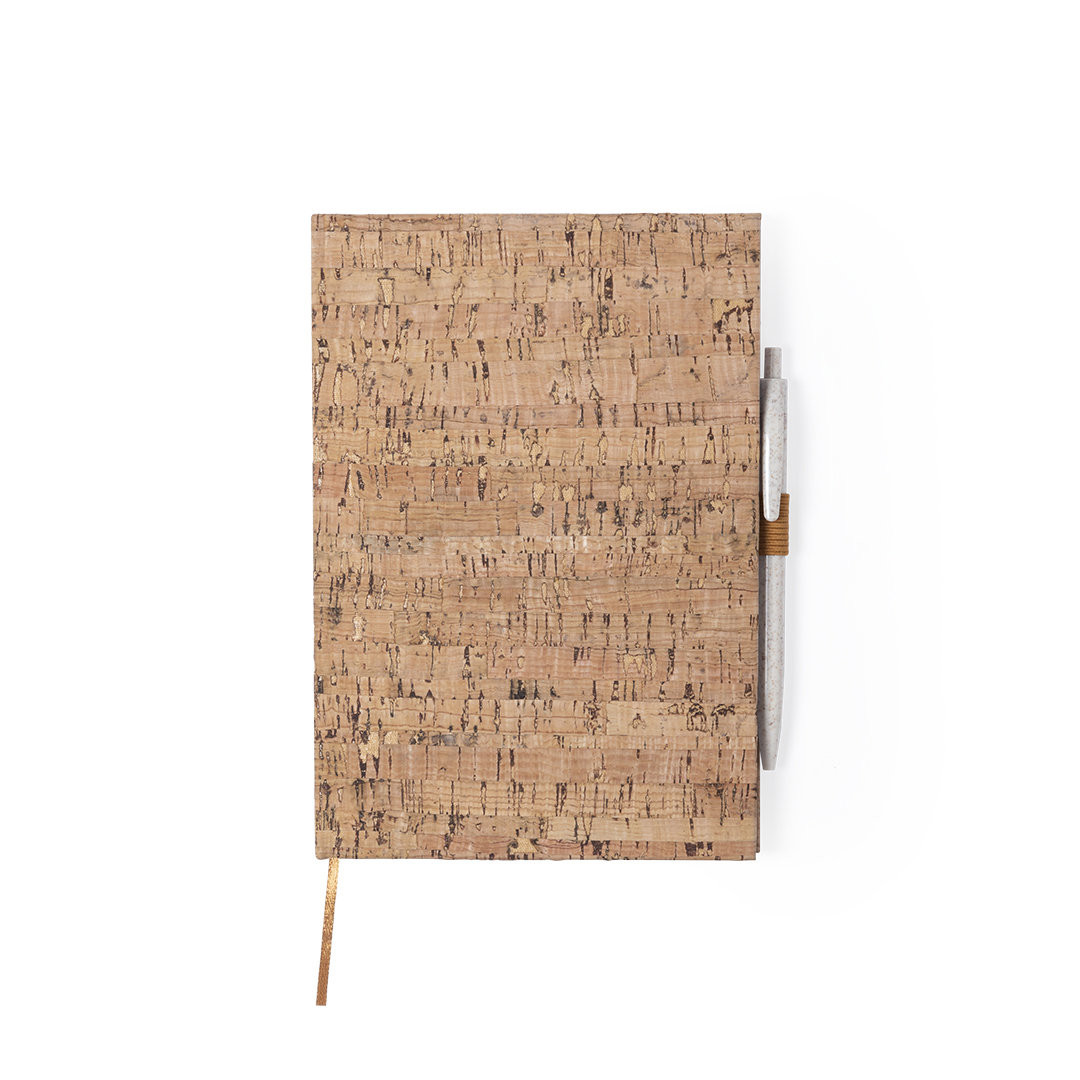 Bloc de notas de línea nature con tapas duras en corcho natural, de sobrio diseño. Incluye 100 hojas blancas lisas, con marcapáginas y soporte para bolígrafo a juego. Portada Rígida. 100 Hojas