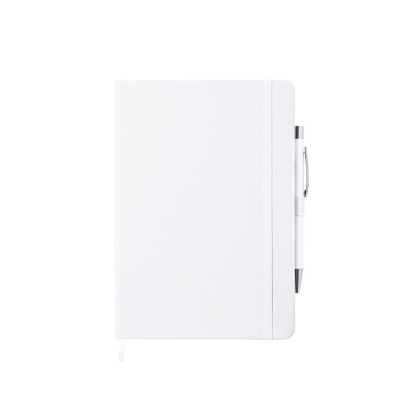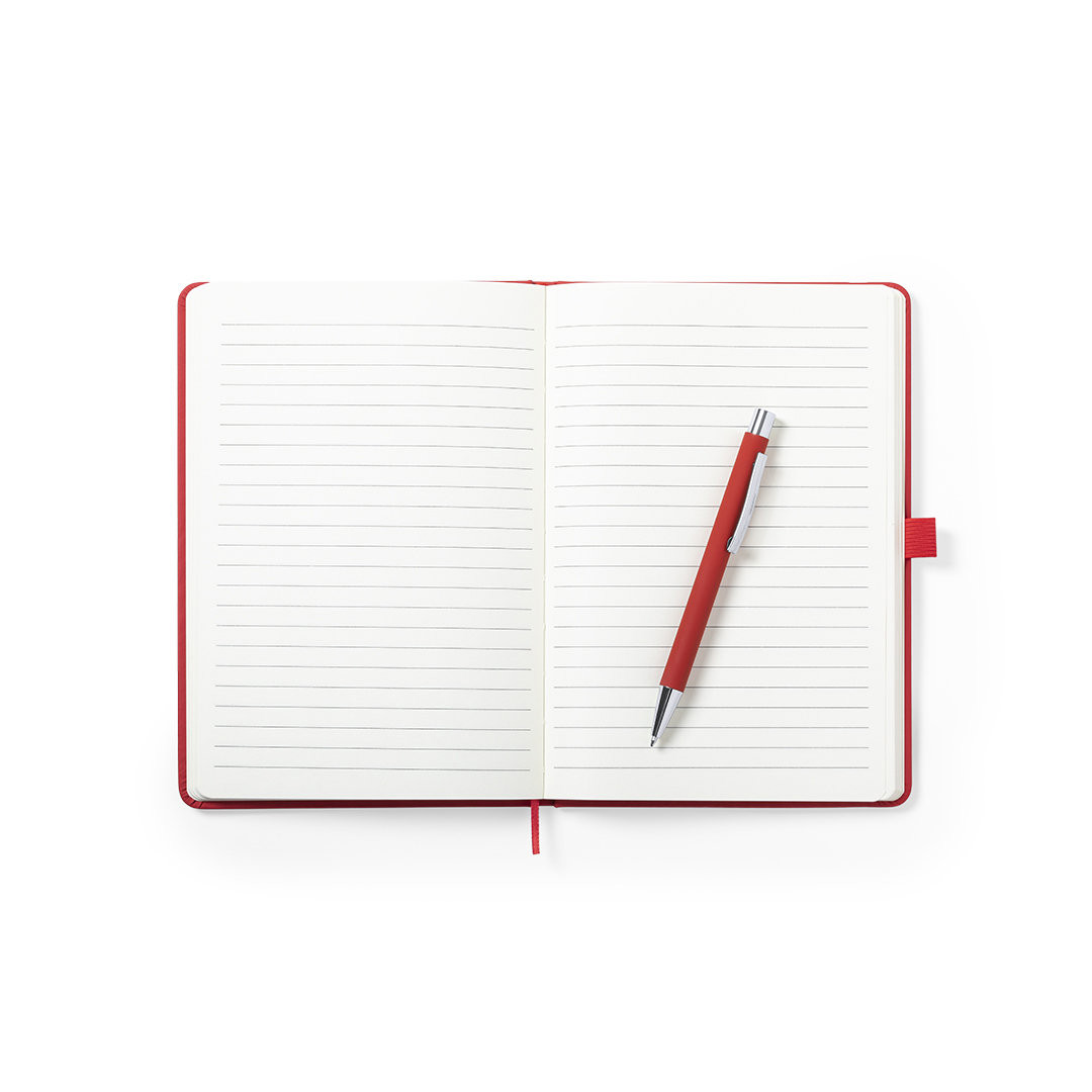 Set de bloc y bolígrafo a juego. Bloc de tapas rígidas con suave tacto acabado en polipiel, incluye soporte para bolígrafo, marcapáginas y cierre elástico, con interior de 100 hojas a una raya. Además, bolígrafo de aluminio en acabado goma con carga jumbo. Disponible en una variada gama de colores. Portada Rígida. 100 Hojas. Bolígrafo Aluminio Incluido. Carga Jumbo