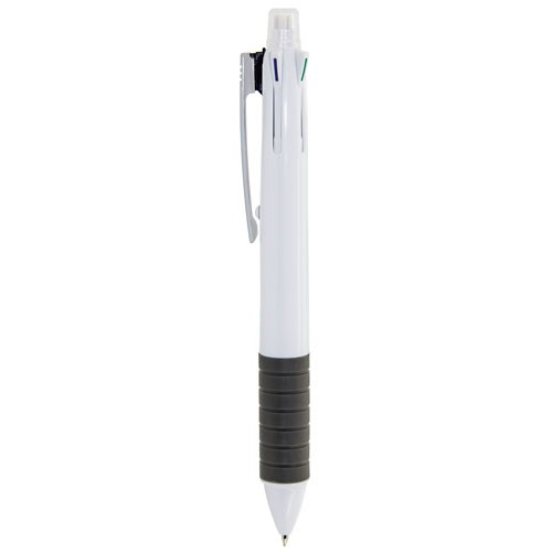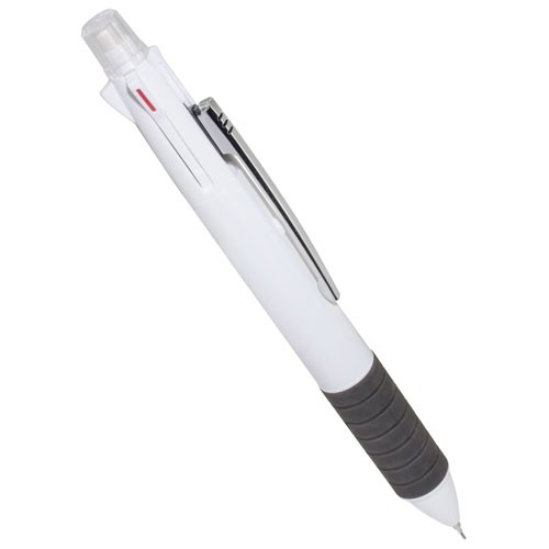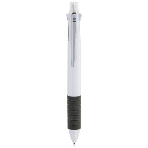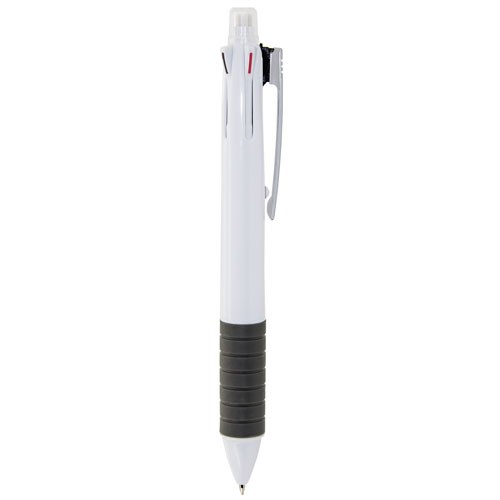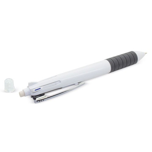 Bolígrafo todo-terreno. El perfecto “all-in-one” para ahorrar espacio y tiempo. Dispone de goma de borrar en el pulsador, con una tapa protectora que evita que la goma se estropee o ensucie. Portaminas, bolígrafo con escritura negro, rojo, verde y azul. Además, dispone de un diseño estilizado y con una sujeción de goma para que la escritura sea aún más confortable.Cada pieza en una bolsa.