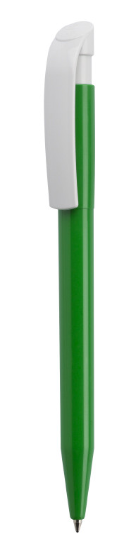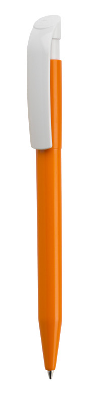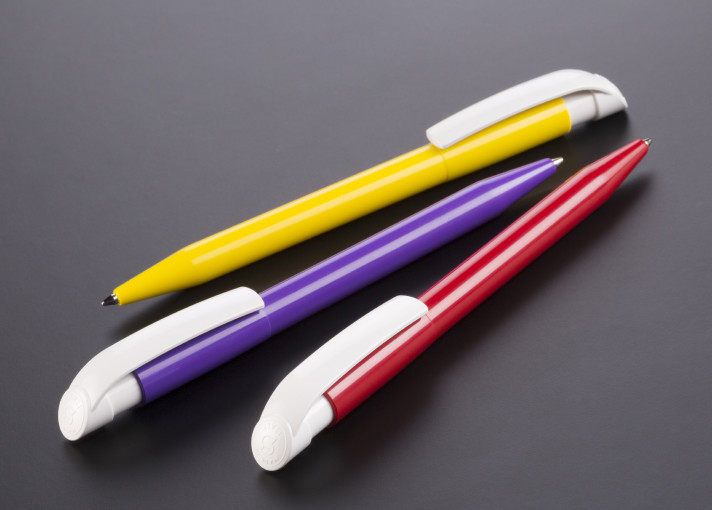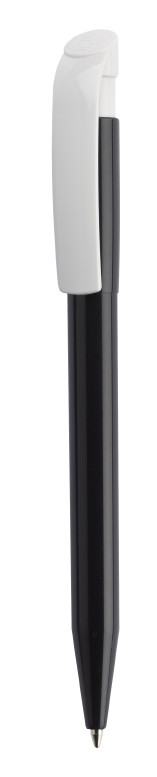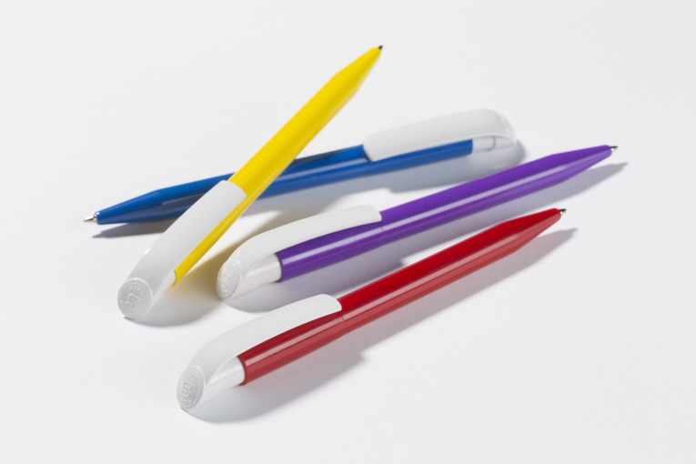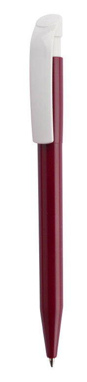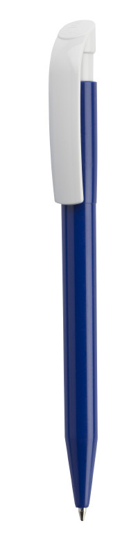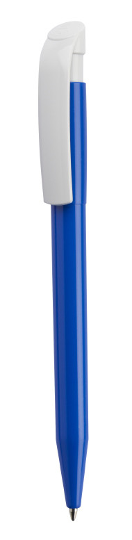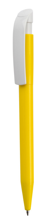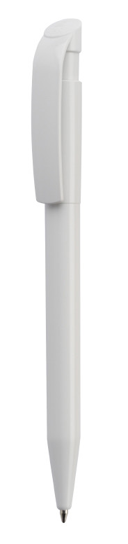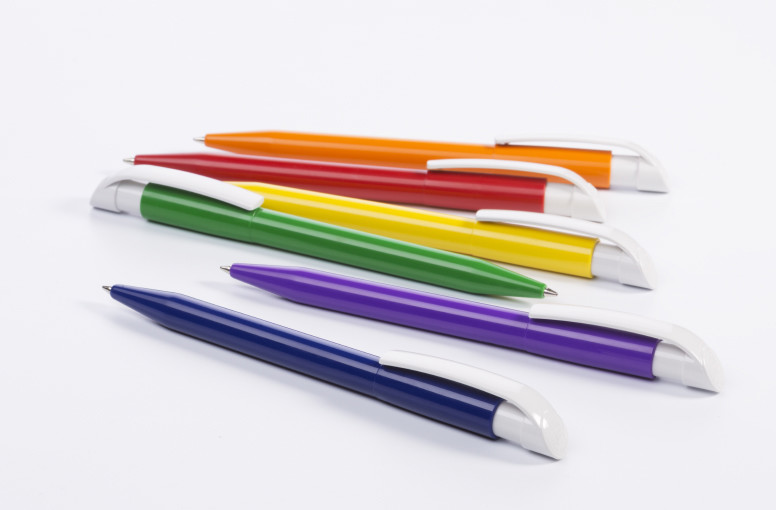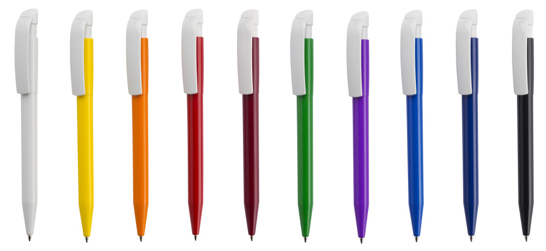 Clásico bolígrafo con mecanismo de pulsador, de atrevido diseño y cuerpo de distintos colores a elegir, con el clip en color blanco, suave acabado. Con cómoda empuñadura. Tinta azul.