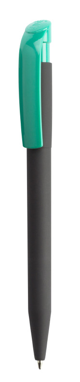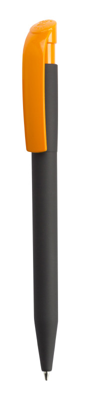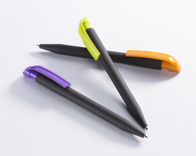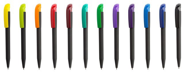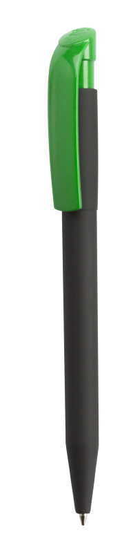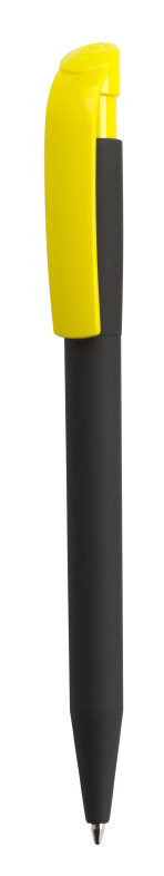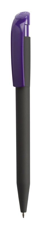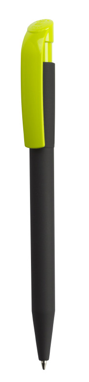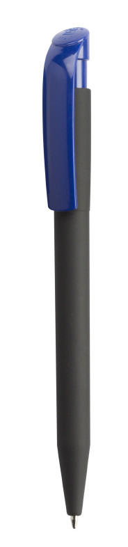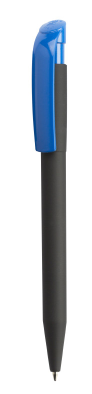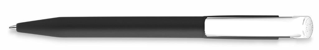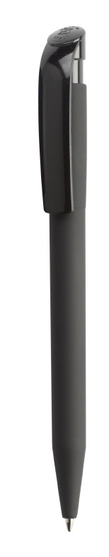 Bolígrafo con mecanismo de pulsador, de atrevido diseño y cuerpo de color negro en goma con suave acabado. Con cómoda empuñadura y clip a elegir. Tinta azul.