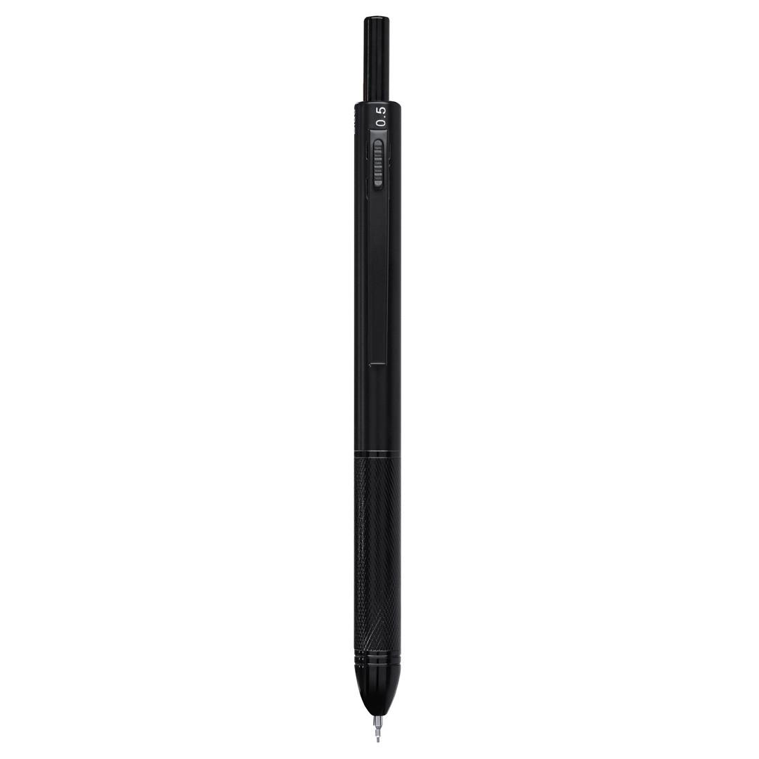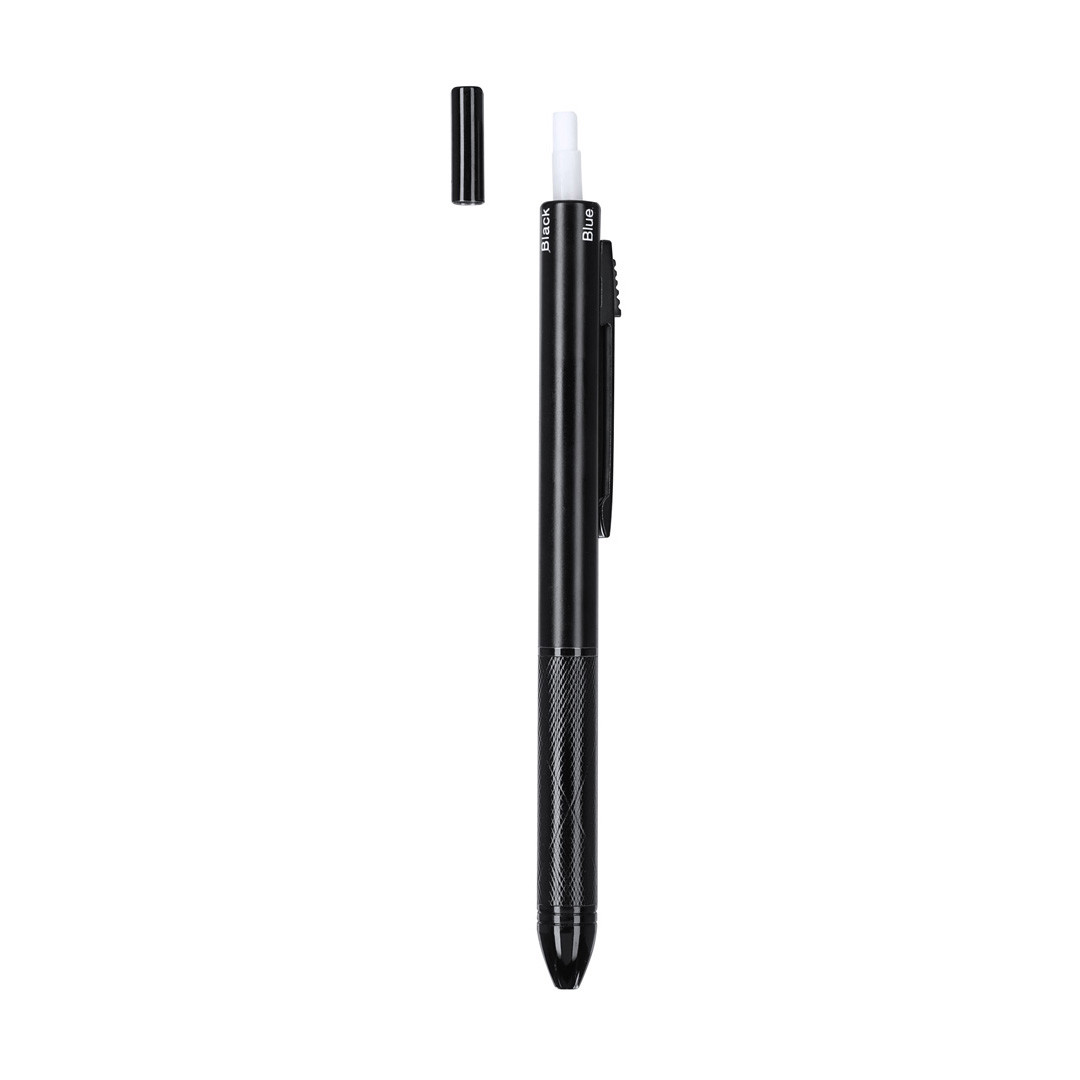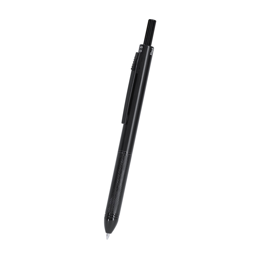 Bolígrafo portaminas 4 en 1, con ingenioso mecanismo de uso. La posición del pulsador permite seleccionar el color de la tinta o la función portaminas. Fabricado en resistente aluminio. Opciónes de tinta azul, negra y roja. Cuenta función portaminas. Incluida 1 mina de 0,5mm. Con goma integrada en el pulsador. Con empuñadura ergonómica y clip a juego. Escritura 3 Colores. Mina 0,5 mm Incluida