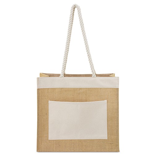 Bolsa de gran capacidad realizada en yuteAsas tipo cuerdas realizadas en algodónIncluye un bolsillo frontal realizado en algodón de medida 27x18,8 cm