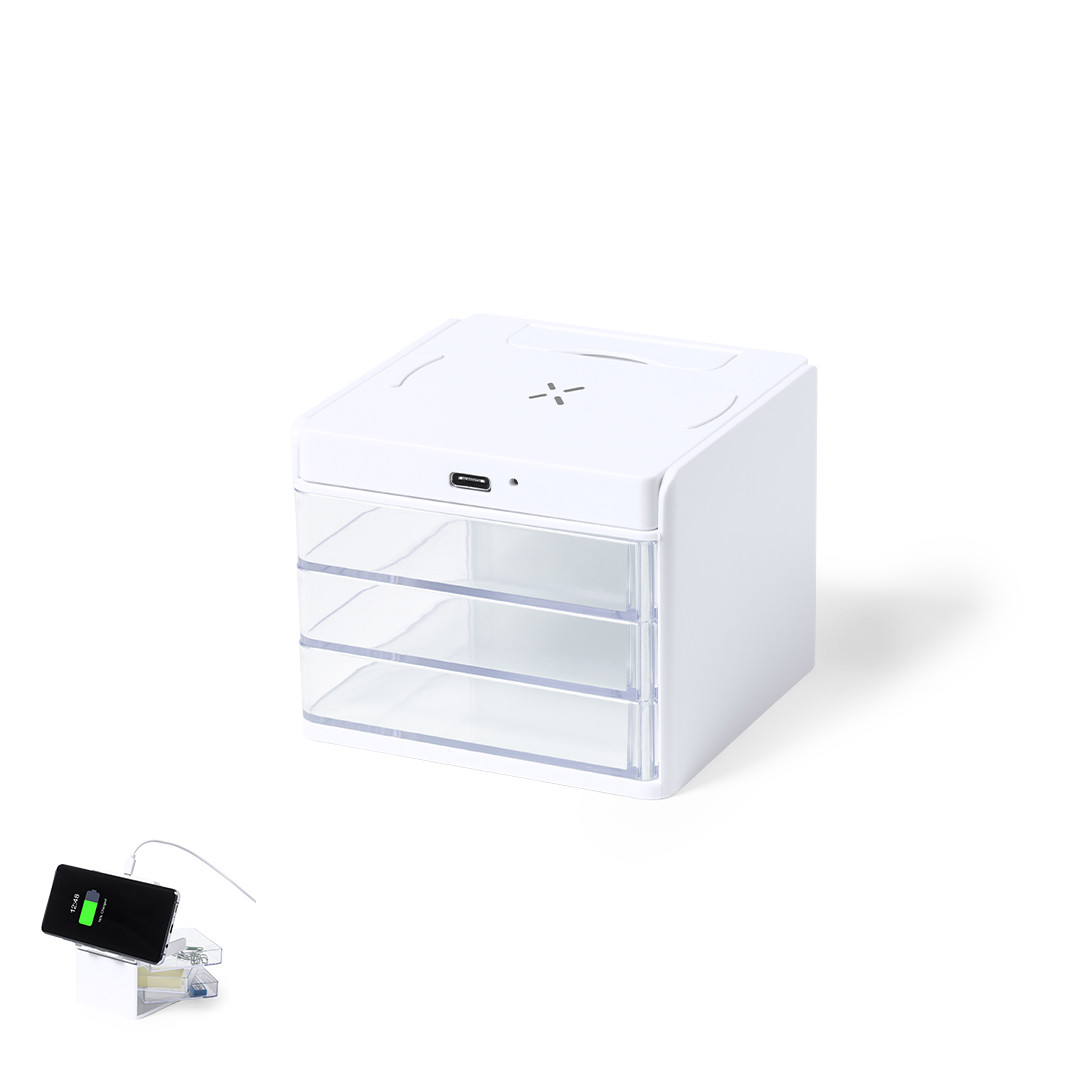 Cargador organizador con soporte para smartphone y cargador inalámbrico 10W integrado, compatible con dispositivos equipados con tecnología de carga inalámbrica Qi. Con 3 compartimentos de almacenaje transparentes y extraíbles. Indicador de estado de carga, con cable de carga Tipo C de 1 m incluido. Base antideslizante y presentado en caja individual de diseño kraft, con manual de instrucciones en español e inglés.Fabricado conforme a los estándares RoHS y en cumplimiento con los siguientes requisitos de seguridad:Sistema de protección contra sobrecalentamiento.Sistema de protección contra sobrecarga.Sistema de bloqueo para evitar cortocircuitos. Inalámbrico 10W