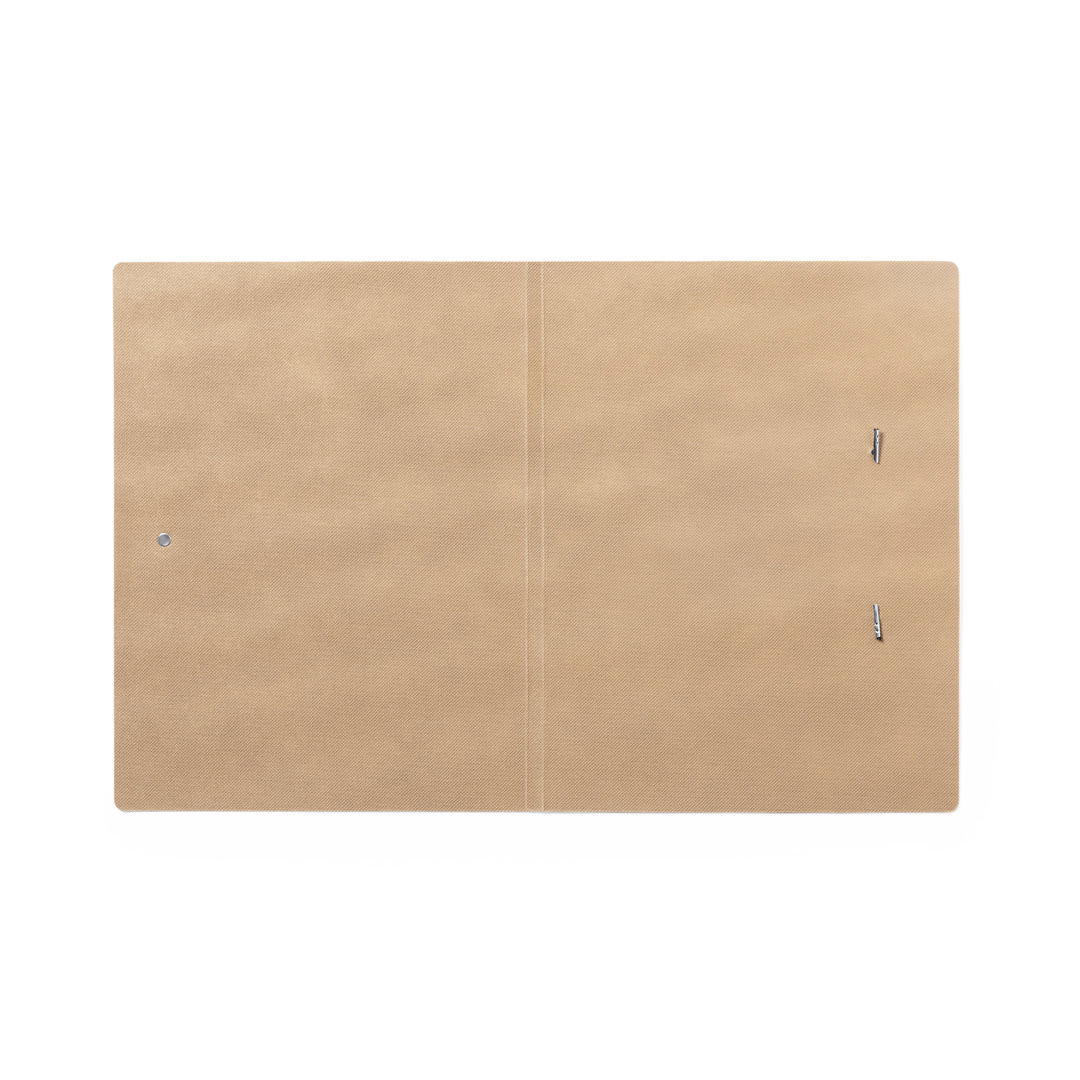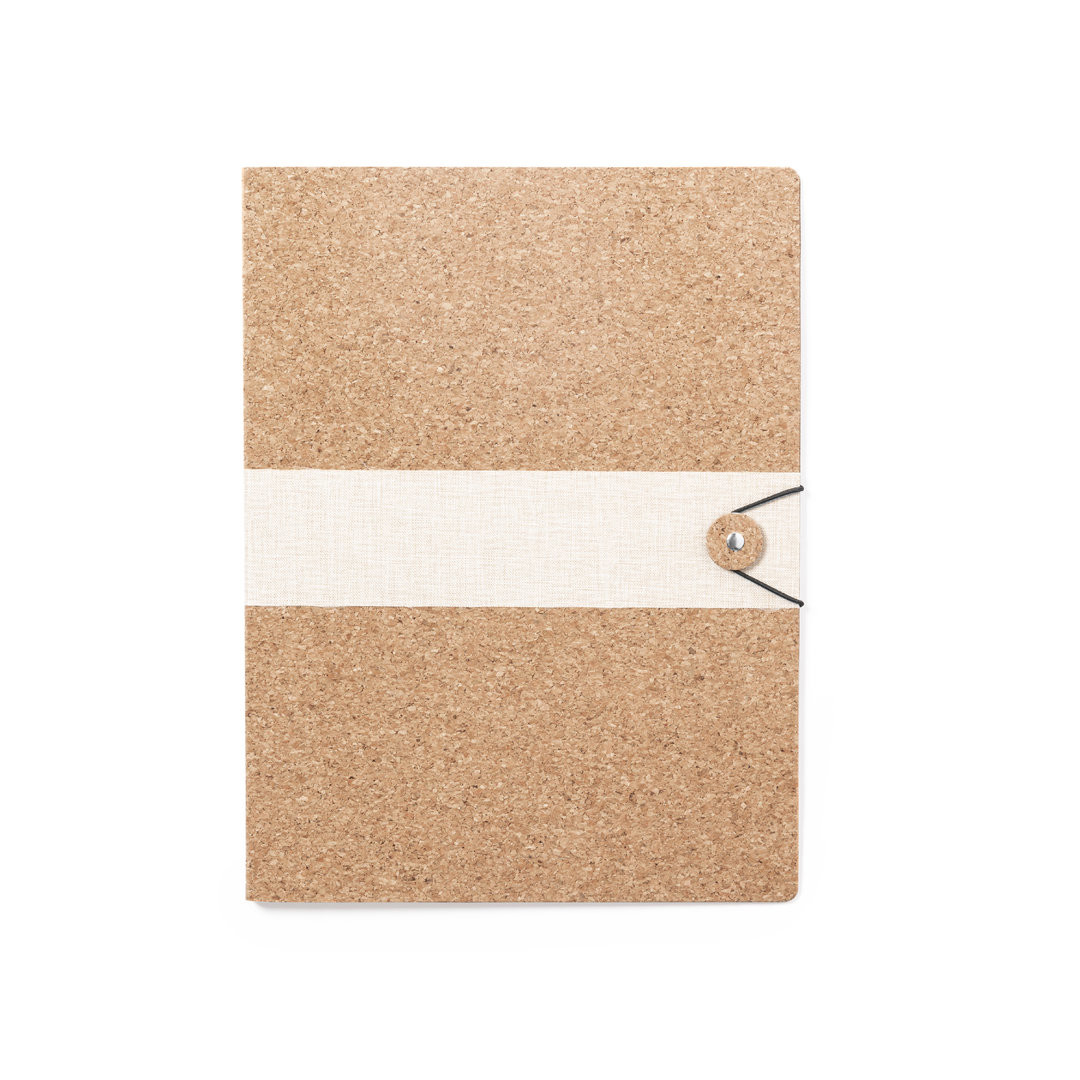 Carpeta de línea nature con exterior en corcho natural y banda central de lino en acabado crudo. Cierre elástico.