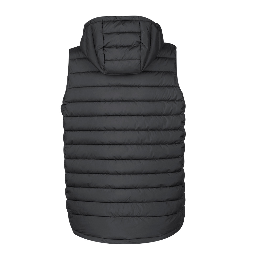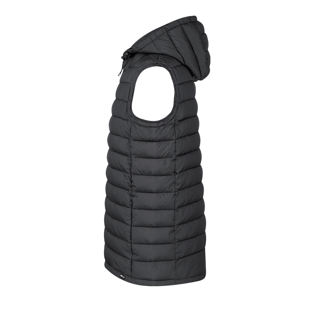 Chaleco unisex en cálido y suave material 100% RPET, con capucha ajustable mediante cintas elásticas. En material extra ligero efecto pluma, resistente al agua y cortavientos. Con acolchado interior, cremallera en cuello con tapeta y cinta en tirador, además de amplios bolsillos laterales con cremallera. Incluye práctica funda de transporte con cordón ajustable y etiqueta con logotipo RPET. Disponible en variada gama de colores y en tallas XS, S, M, L, XL, XXL.El material RPET se elabora a partir de plástico reciclado, para así fomentar la reutilización de residuos plásticos y ayudar a la sostenibilidad del planeta. Resistente al Viento y al Agua. Funda Poliéster RPET