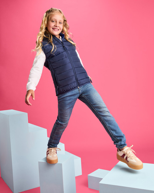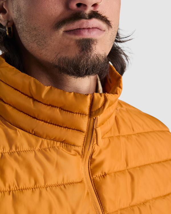 Chaleco acolchado resistente al viento y repelente al agua. Cremallera frontal invertida al tono con protector de barbilla del mismo tejido. Bolsillos laterales con cremalleras invertidas al tono insertado en los paneles laterales. Vivo elástico al tono en sisas y bajo. Opción de colores lisos o a contraste en interior.