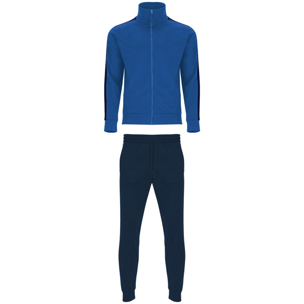 Chándal con bandas a contraste clásico perchado. Chaqueta de cuello alto y cubrecosturas. Cremallera frontal al tono con tirador. Bolsillos laterales con cremallera en tallas de adulto. Cuello, puños y cintura en canalé de 1x1. Pantalón con cintura elástica y cordón ajustable. Bolsillos laterales y uno trasero con cremallera. Pieza lateral a contraste de color. Puños en canalé de 1x1.
