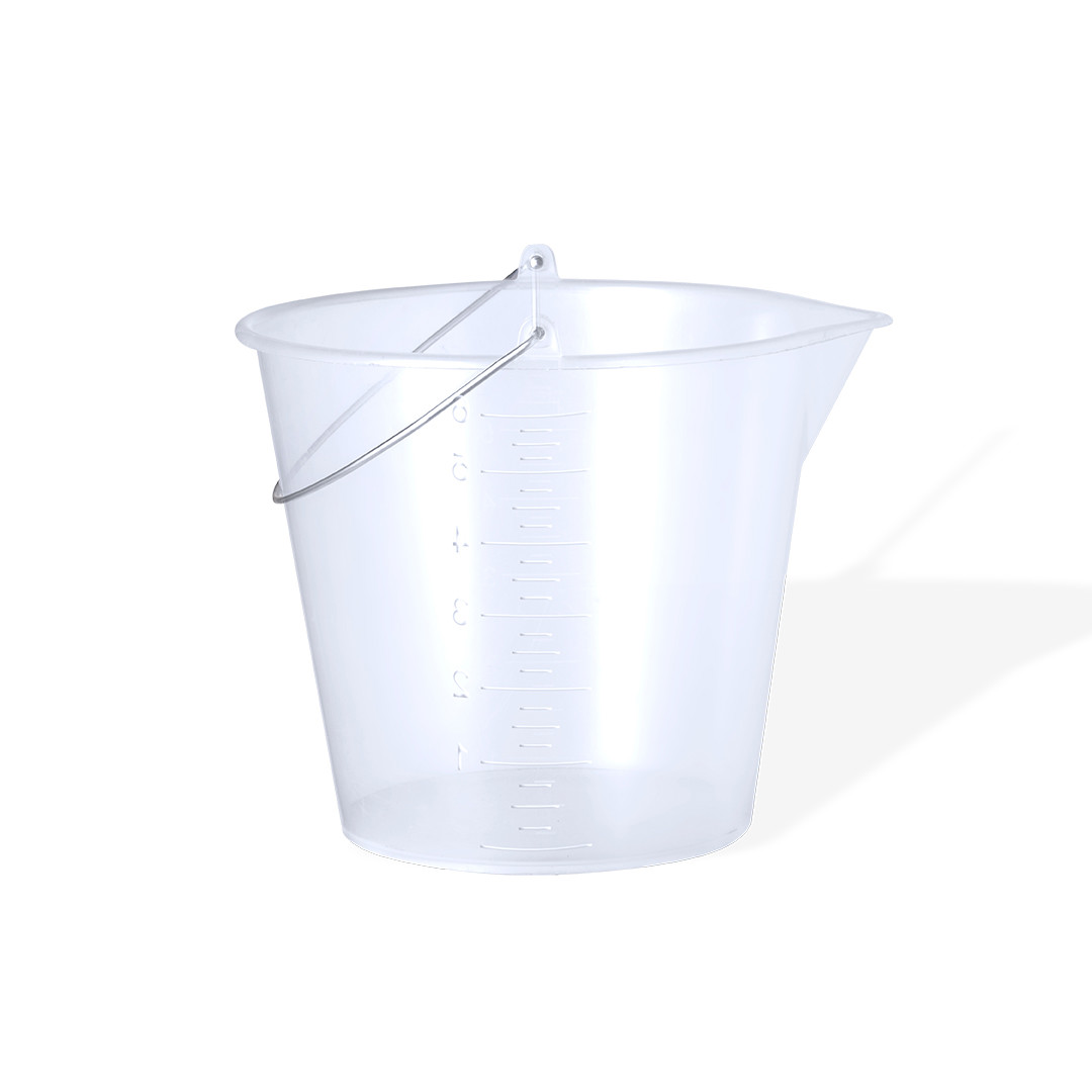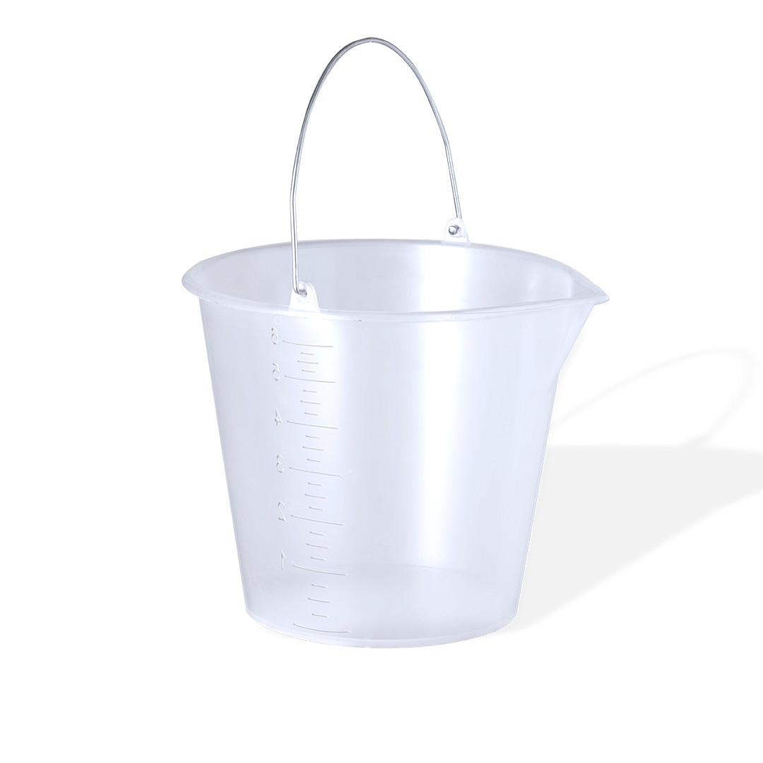 Cubo de 6L fabricado en resistente PP transparente. Con asa metálica y medidor lateral en ml para una rápida y fácil visualización. De perfil redondeado y con vertedor para evitar derrames, además de una amplia zona de marcaje. 6 L