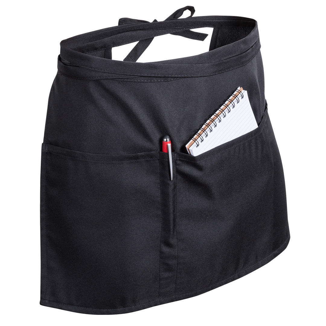 Delantal para cintura en material 100% poliéster de suave acabado en elegante color negro. Con 2 bolsillos grandes, bolsillo mediano y funda par bolígrafo. Ajustable mediante cintas.