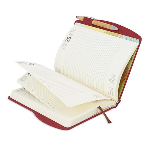Incluye porta bolígrafo y dietario día página de color crema.
