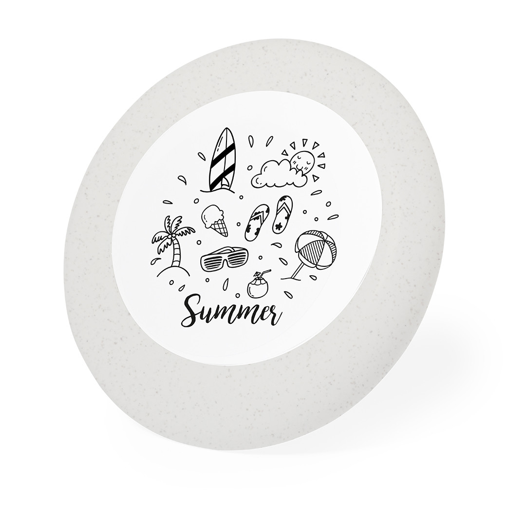 Original frisbee personalizable fabricado en caña de trigo. Divertido conjunto de ceras y frisbiee con zona para poder colorear el original dibujo de naturaleza. Presentado en bolsa de papel reciclado. Incluye:Frisbee con dibujo de naturaleza para colorear.Caja de 6 ceras en multitud de colores. 6 Ceras Incluidas