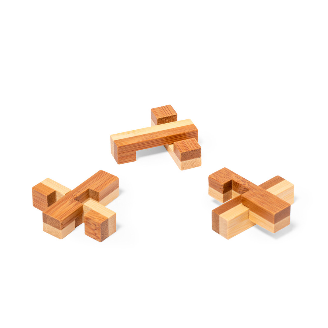 Juego de habilidad de 6 piezas fabricado en suave bambú. Un divertido rompecabezas perfecto para el entretenimiento: hay que ensamblar las piezas en una combinación única que nos mostrará la figura buscada. Presentado individualmente en una caja de diseño kraft.Materiales como el bambú fomentan la utilización de materias primas naturales, reduciendo las emisiones contaminantes. Proviene de una planta de gran resistencia y versatilidad, con crecimiento y regeneración rápidos, siendo una excelente alternativa al uso de madera tradicional. 6 Piezas