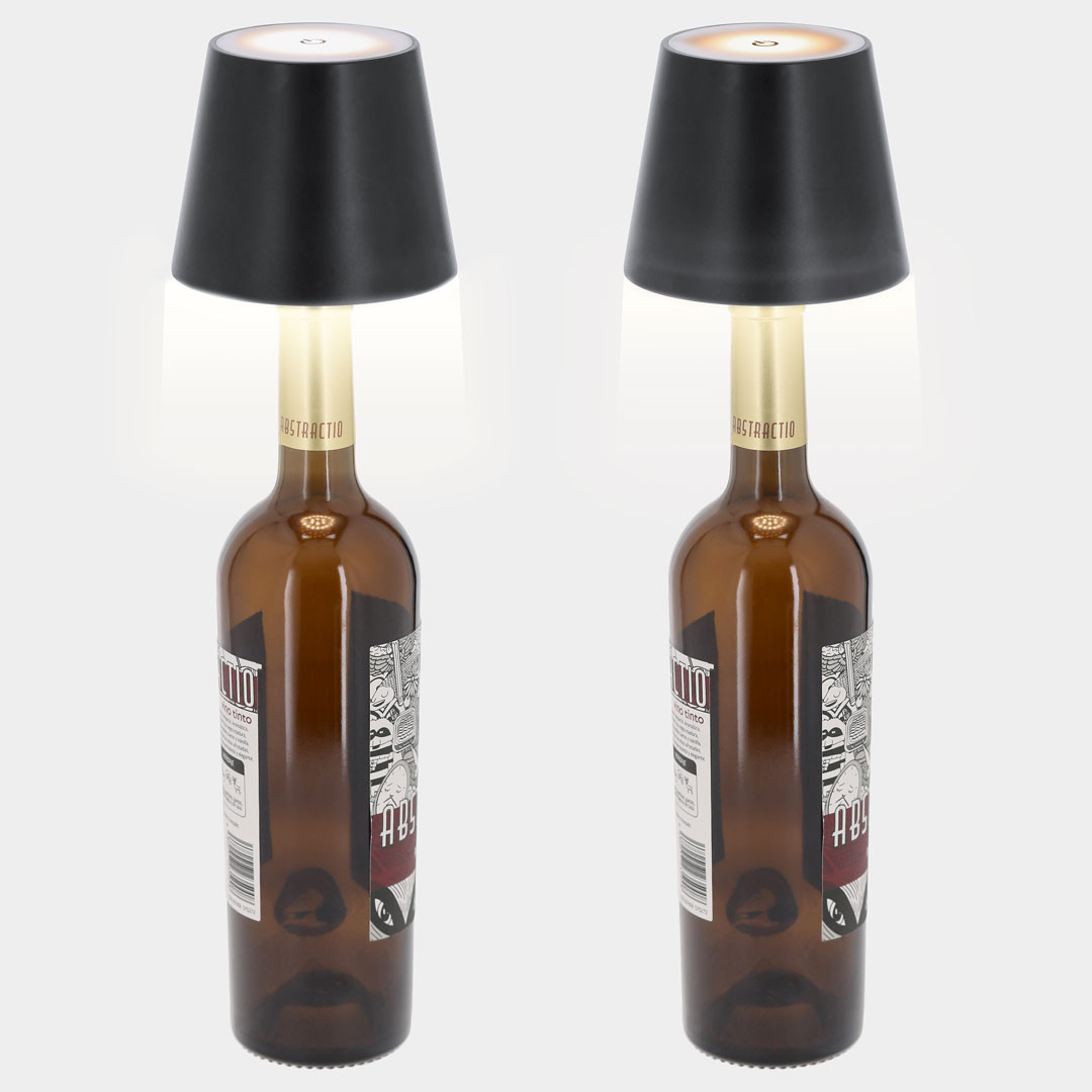 Lámpara LED con adaptador para insertar en la botella, creando así una original lámpara. Con 31 LEDs (27 blancos y 4 amarillos) de intensidad regulable por botón táctil. Con batería de 800mAh recargable por USB, cable Tipo C incluido. 31 Ledes. Intensidad de Luz Regulable. Batería 800 mAh