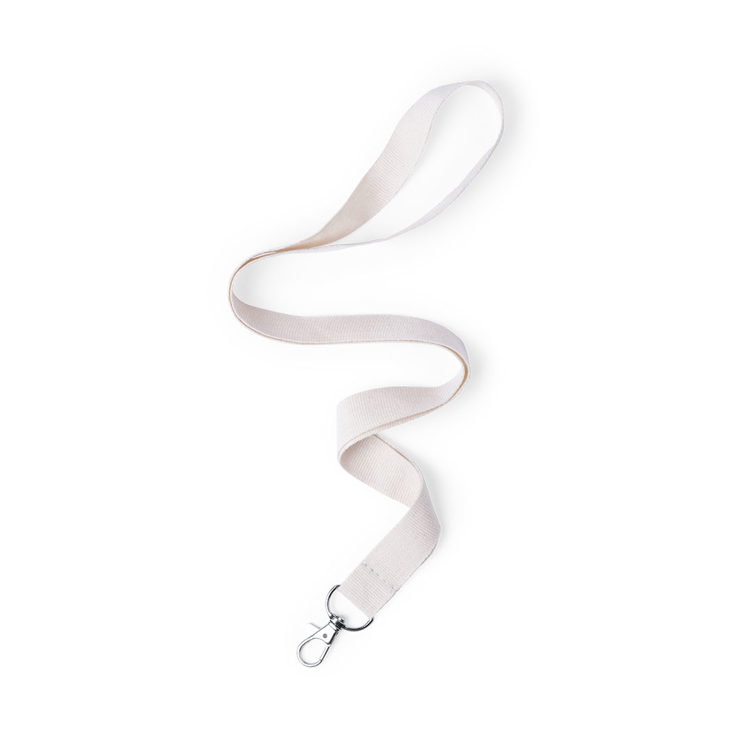 Lanyard de línea nature en material 100% algodón. En color crudo y con mosquetón metálico.