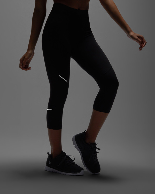 Malla media pierna running mujer transpirable. Cinturilla engomada con cordón cruzado ajustable. Detalles reflectantes. Mini bolsillo trasero.