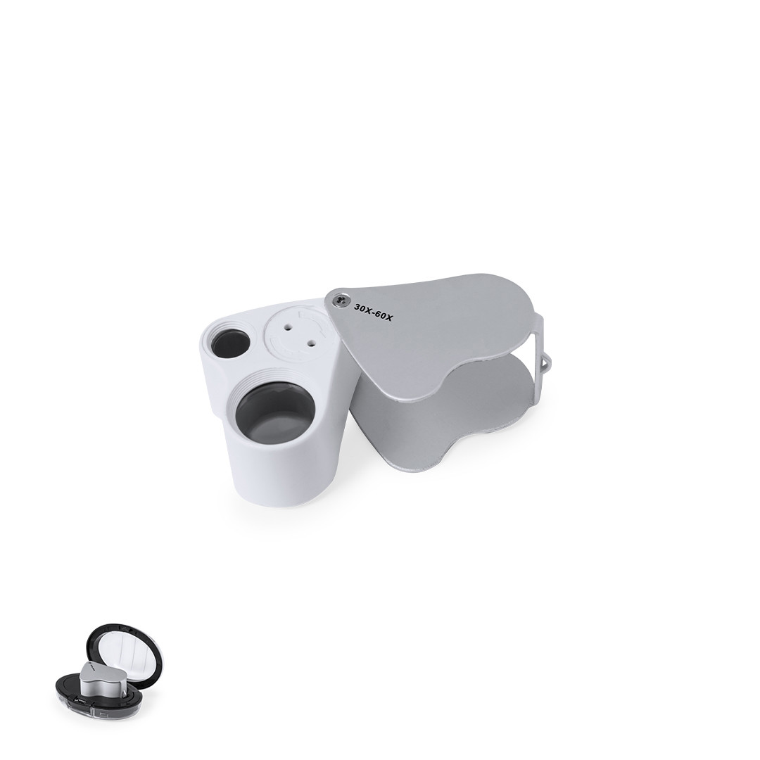 Lupa plegable doble con aumento 30x y 60x, fabricada en resistente metal. Con luces LED integradas y gran potencia de aumento para obtener una visión muy cercana de los detalles más pequeños y ampliación sin distorsión. Ideal para inspeccionar objetos de tamaño reducido, textos, etc. Además, tiene un accesorio para colgar, y viene dentro de un estuche con interior acolchado para una mayor protección. Alimentación a pilas (de botón incluidas), con llave especial para reemplazarlas cuando se agoten. Presentada en caja de cartón negra. 2 Ledes. Pilas Botón Incluidas