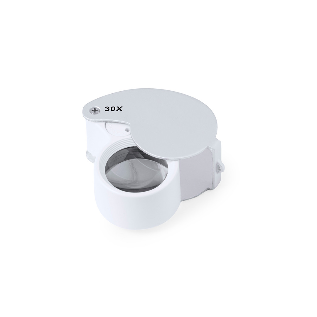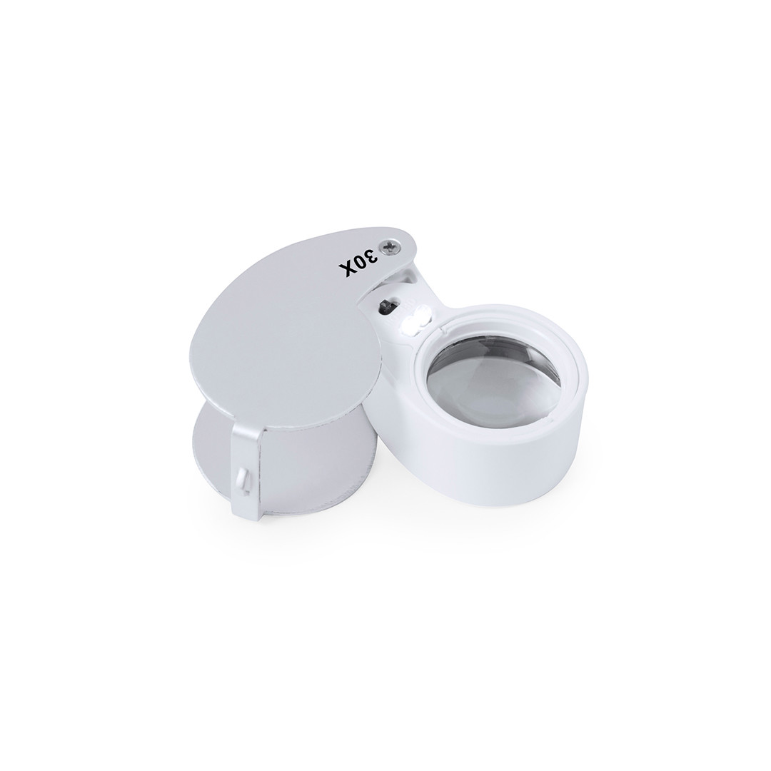 Lupa plegable doble con aumento 30x , fabricada en resistente metal. Con luces LED integradas y gran potencia de aumento para obtener una visión muy cercana de los detalles más pequeños y ampliación sin distorsión. Ideal para inspeccionar objetos de tamaño reducido, textos, etc. Además, tiene un accesorio para colgar, y viene dentro de un estuche con interior acolchado para una mayor protección. Alimentación a pilas (de botón incluidas), con llave especial para reemplazarlas cuando se agoten. Presentada en caja de cartón negra. 2 Ledes. Pilas Botón Incluidas