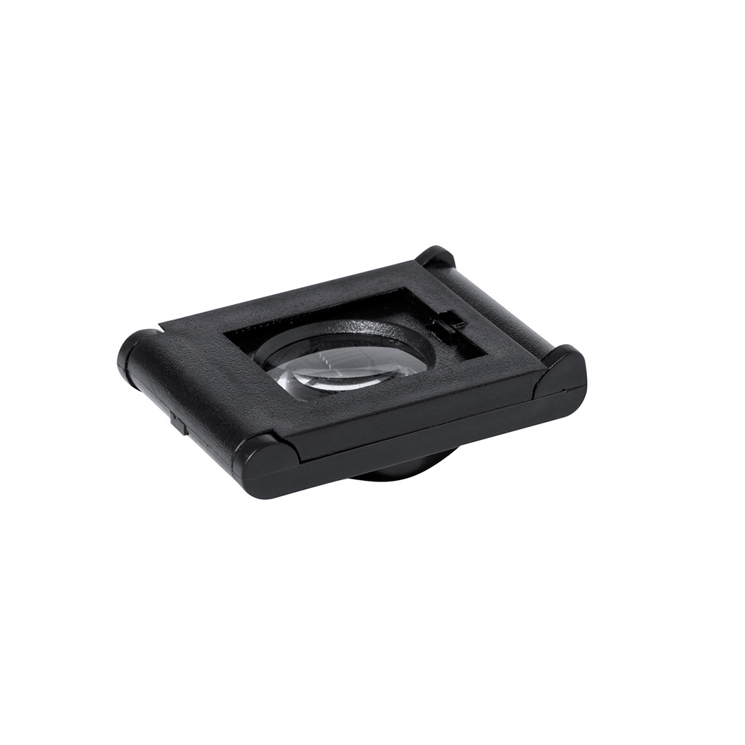 Lupa plegable de 8 aumentos fabricada en resistente PP, con luz LED integrada y regla de medición, Alimentada con pila de botón (incluida) y presentada en caja individual negra de cartón negro. 1 Led. Con Regla para Medición. Pilas Botón Incluidas