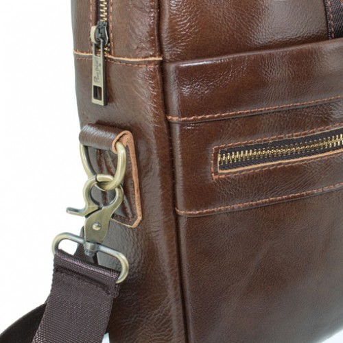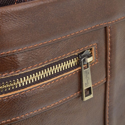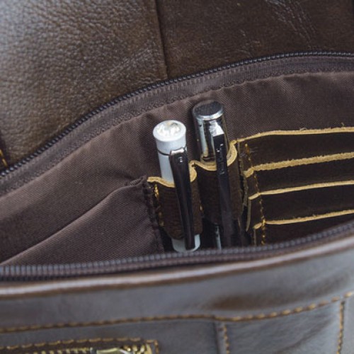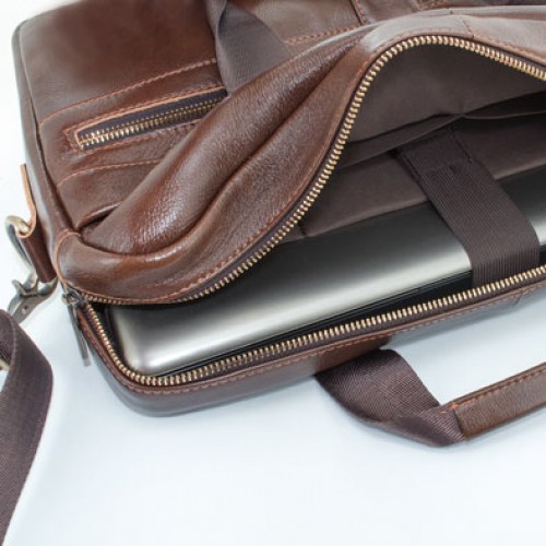 Realizado en auténtica piel, con asas y cinta para colgar en el hombro.Bolsillos exteriores con cierre cremallera e interior acolchado.Cada pieza en bolsa individual