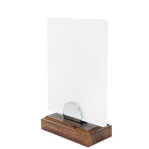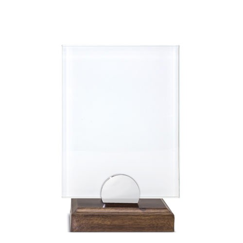 Placas de cristal de alta calidad presentadas en una peana de madera maciza, con un diseño elegante, ideal para regalar en eventos o como conmemoración. La placa puede cambiar de posición, vertical u horizontal, para adaptarse a tu diseño. Su grabación en sublimación le permite personalizar el trofeo a todo color. Presentación en caja acolchada con cierre imantado.