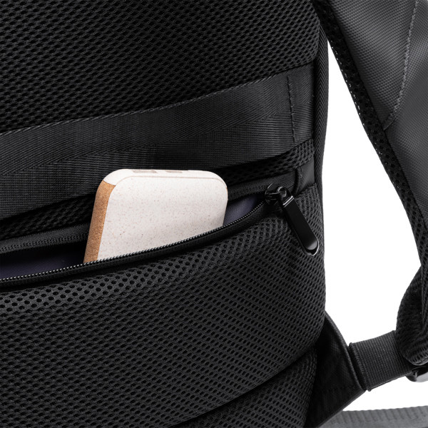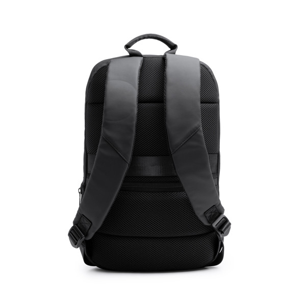 Mochila antirobo extensible, fabricada en PU Leather con asas y espalda acolchadas. Con un compartimento con bolsillo en la parte posterior de la mochila. Cuenta con un compartimento principal con diferentes secciones acolchadas pensadas para portátil de 14" y otros dispositivos electrónicos. Además, incluye un bolsillo frontal exterior acolchado y bolsillos laterales. Incluye una cinta para trolley, para que puedas sujetarla a tu equipaje de mano durante tus viajes.