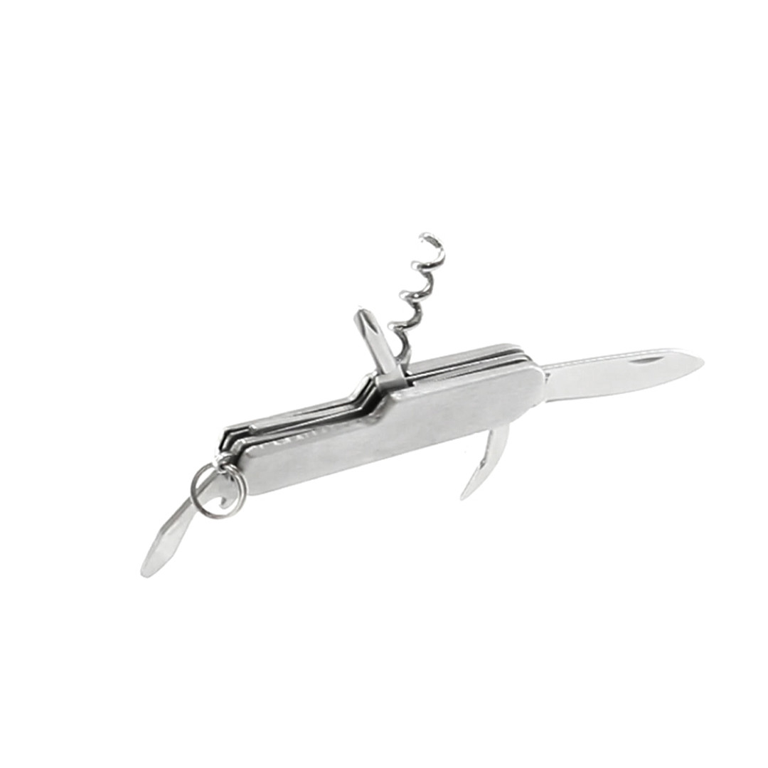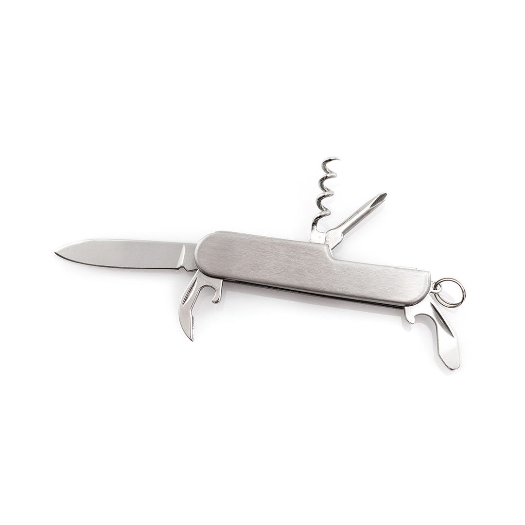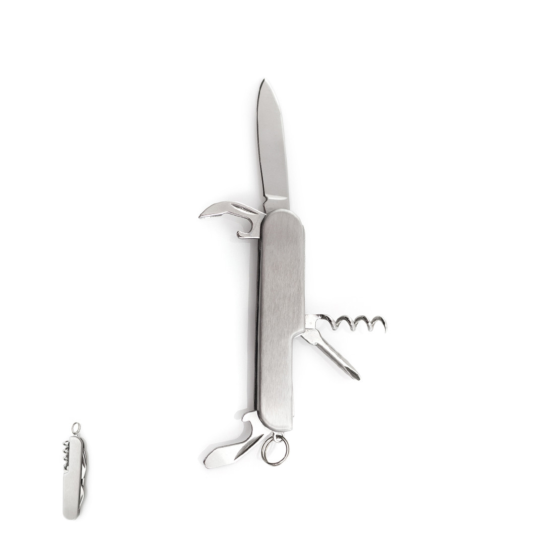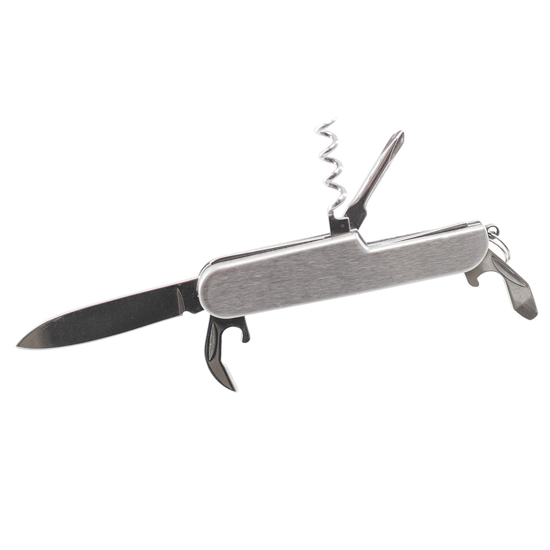 Navaja multiusos de acero inox de 6 funciones. Incluye navaja, abridores, destornillador y anilla para llavero. Presentada en caja individual. 6 Funciones