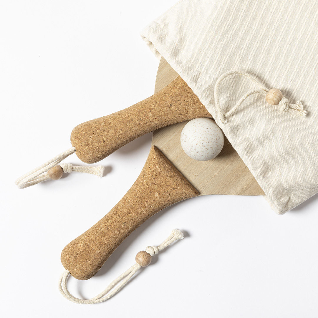 Par de palas de playa de línea nature. Fabricadas en madera, con mango reforzado en corcho natural y cintas para muñeca con ajustador. Presentadas en bolsa de algodón natural con cierre de cordón y pelota en caña de trigo. Funda Algodón