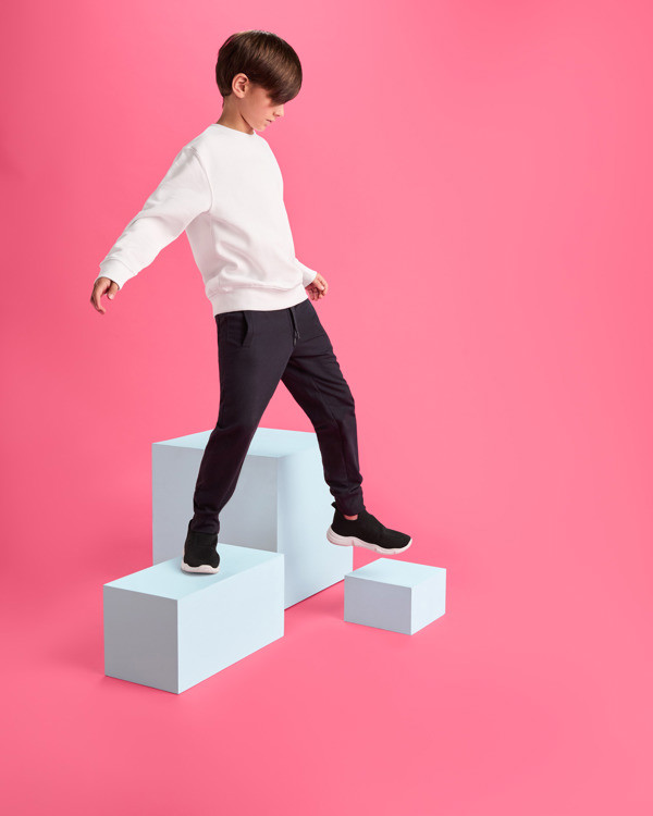 Pantalón largo recto de felpa no perchada básico. Bolsillos laterales con cremallera en tallas de adulto. Cinturilla engomada con cordón ajustable y ojales metálicos. Bolsillo trasero con cierre de velcro. Puños en rib 1x1.