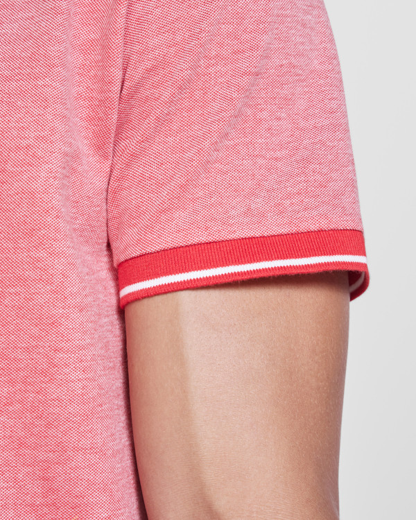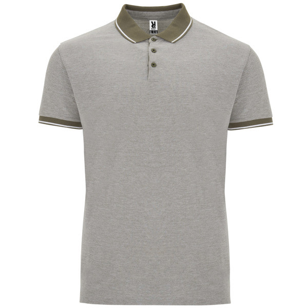Polo Vigoré de manga corta. Cuello y bocamangas en color solido con canalé 1x1 y detalle decorativo a contraste. Tapeta interior con cinta decorativa a contraste y tres botones. Bajo con apertura lateral reforzada y cinta decorativa. Espalda ligeramente más larga que el delantero.