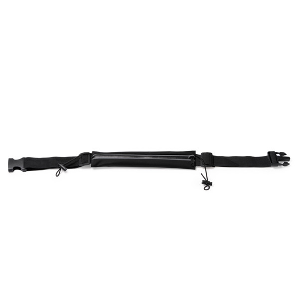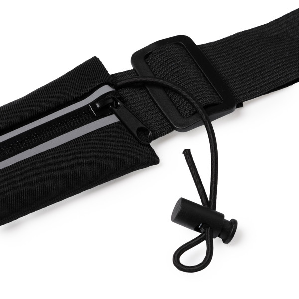 Riñonera portadorsal realizada en políester spandex. Con bolsillo con banda reflectante y cierre de cremallera resistente al agua. Incluye elástico para dorsal.