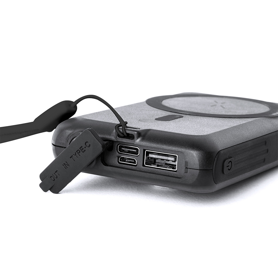 Batería auxiliar externa de recarga solar y de gran capacidad de carga -5.000 mAh-. Con cargador inalámbrico integrado 5W y fijación magnética Magsafe, permitiendo usar el dispositivo mientras se está cargando y compatible con dispositivos equipados con tecnología de carga inalámbrica Qi. Además, cuenta con una luz LED con dos posiciones de luz, fija e intermitente. Fabricada en resistente ABS de color negro, con conector de entrada/salida Tipo C + 1 salida USB + 1 entrada Micro USB. Presentada en atractiva caja individual de diseño.Las capacidades mostradas en todas nuestras baterías auxiliares externas son reales, incorporando todas ellas baterías de grado A y no recicladas, con una vida útil de al menos 500 ciclos de carga y según normativa CE. Además, están fabricadas conforme a los estándares RoHS y en cumplimiento con los siguientes requisitos de seguridad:Sistema de protección contra sobrecarga del power bank.Sistema de protección contra descarga completa que proporciona una may