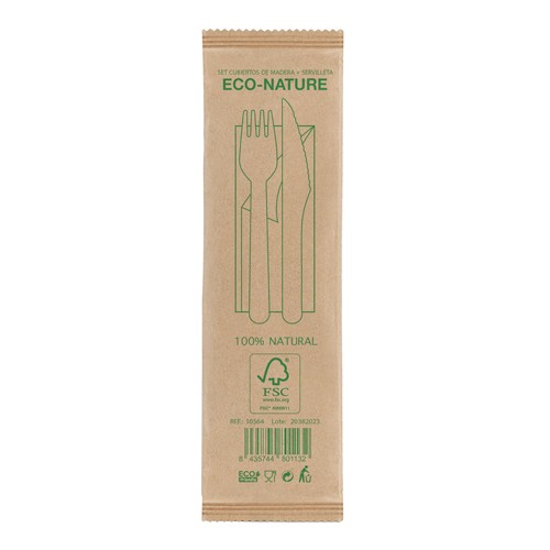Set de Cubiertos ecológicos, fabricados con madera procedente de fuentes sostenibles. Incluye tenedor, cuchillo y servilleta (se vende en cajas de 500 unidades cantidad mínima)
