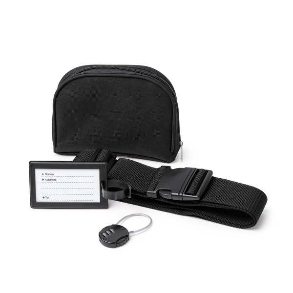Set de viaje 3 en 1. Incluye candado con contraseña numérica de tres dígitos, tarjeta identificadora elaborada en PP y una cinta ajustable para maleta para dotarla de mayor seguridad. Todos estos accesorios se presentan en una funda elaborada en RPET con cierre de cremallera con apertura completa del mismo.