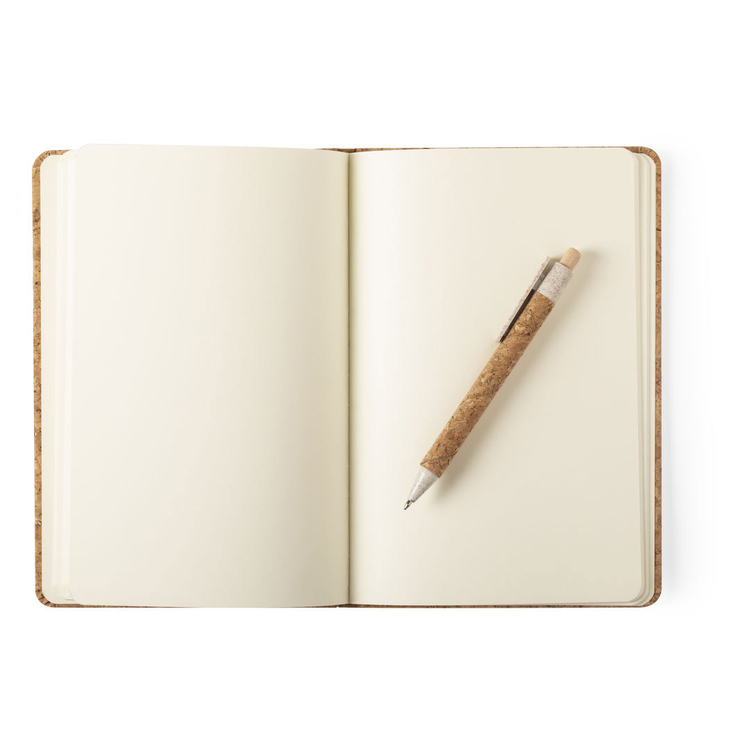 Set de bloc de notas y bolígrafo en línea nature. Incluye bloc de notas con tapas rígidas en corcho natural, con 80 hojas lisas. Bolígrafo de mecanismo pulsador, con cuerpo en corcho natural y accesorios en caña de trigo, para así fomentar la utilización de materias primas naturales y reducir las emisiones contaminantes. Presentado en estuche de cartón troquelado y diseño eco. Tinta negra. Portada Rígida. 80 Hojas. Bolígrafo Corcho/ Caña de Trigo/ ABS. Tinta Negra