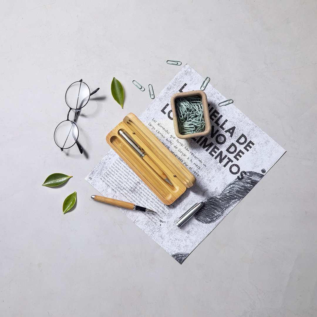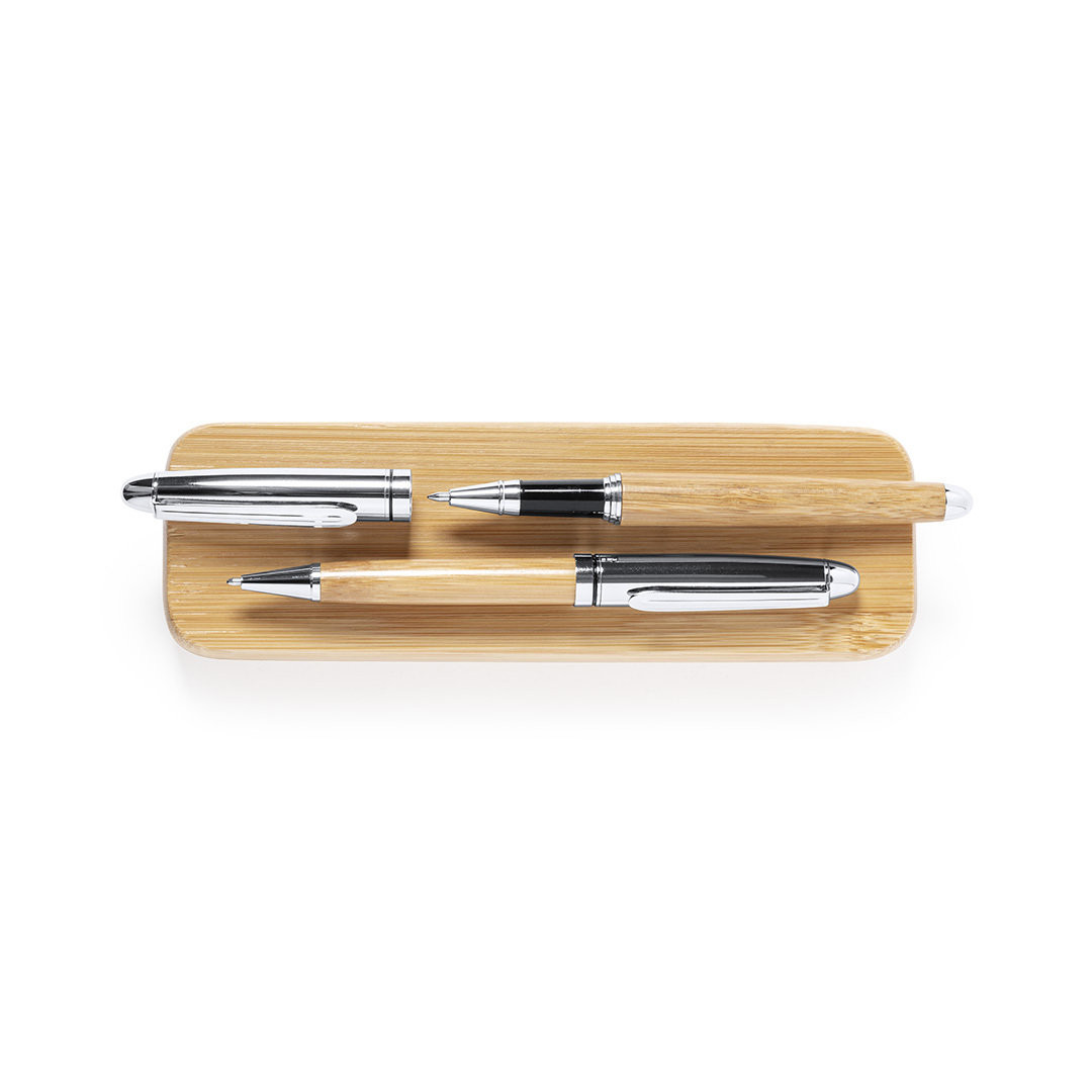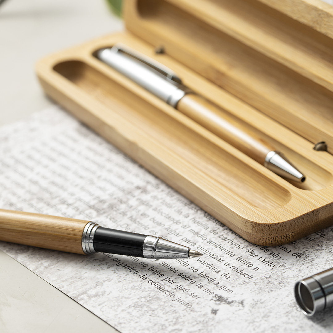 Set de bolígrafo y roller de línea nature. Fabricado en combinación de bambú con metal, para así fomentar la utilización de materias primas naturales y reducir las emisiones contaminantes. Bolígrafo de mecanismo giratorio en tinta azul. Roller con capucha, tinta gel en azul y carga jumbo. Presentado en estuche individual de bambú. Bolígrafo y Roller. Carga Jumbo