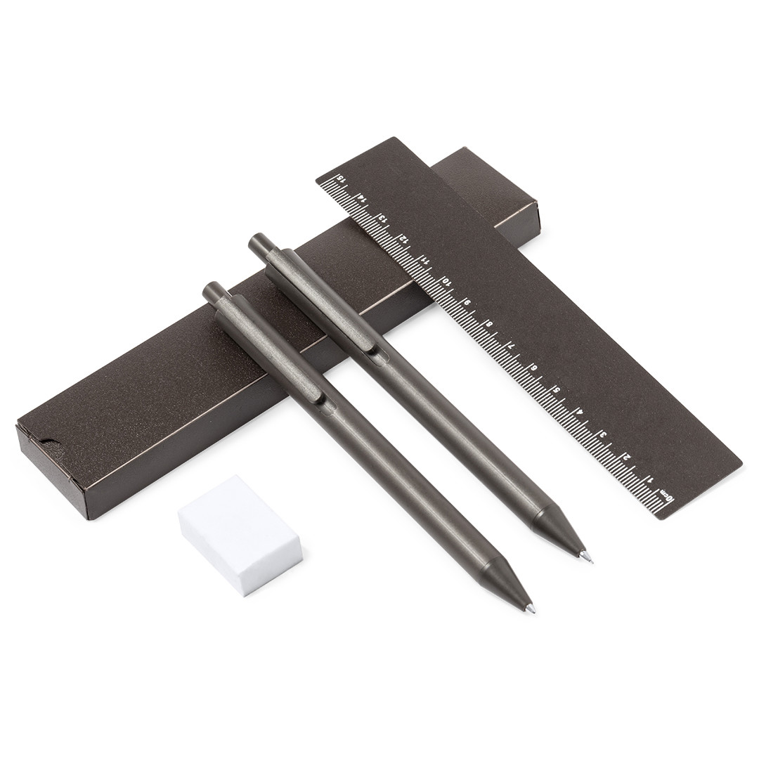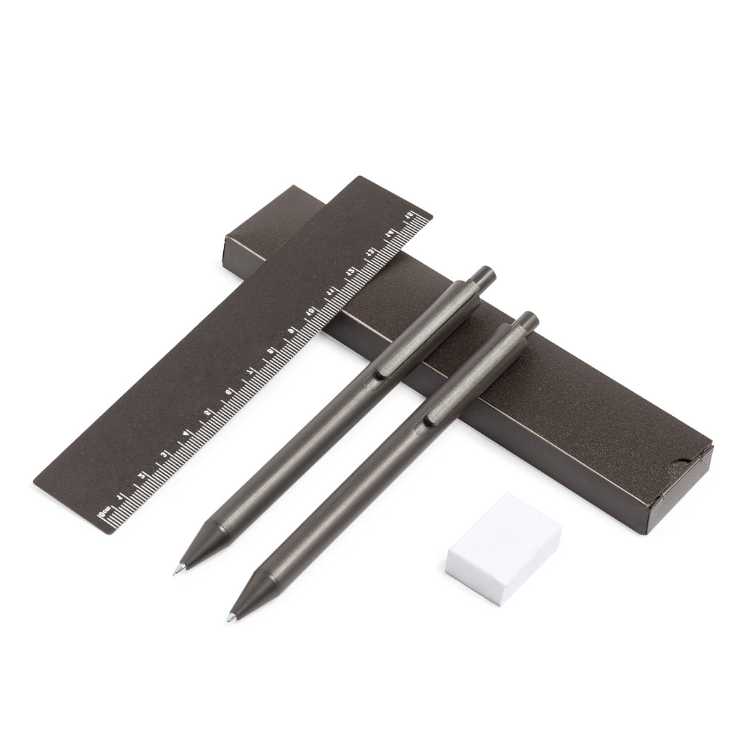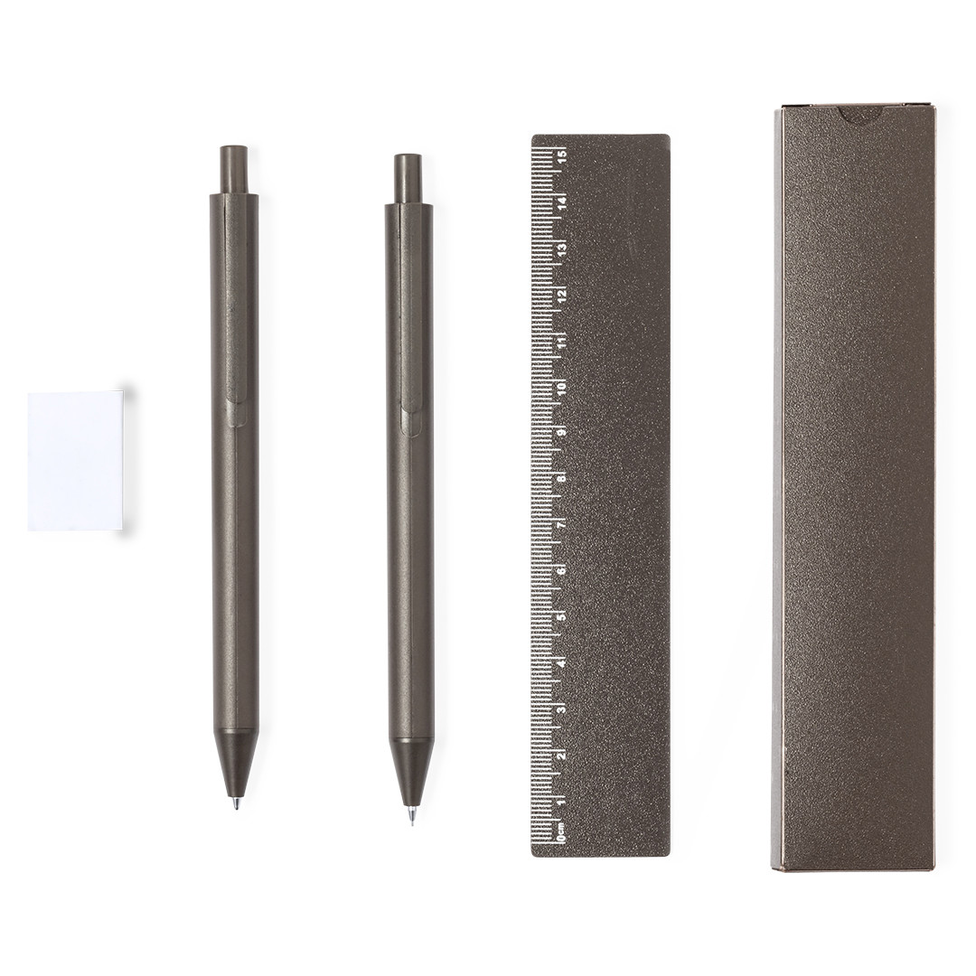 Set de bolígrafo, portaminas y regla, fabricados en fibra de café. Bolígrafo en tinta azul y portaminas con 2 minas incluidas de 0,7mm, ambos con clip. Incluye una práctica regla de 15 cm y útil goma. Presentado en estuche individual de fibra de café. Logotipo fibra de café en la parte superior del bolígrafo y portaminas.La fibra de café es una solución circular que se obtiene de la utilización de los residuos producidos en la obtención del café. Una alternativa sostenible que favorece la reducción del uso de plásticos, ahorrando energía en su proceso de fabricación y contribuyendo al cuidado del medio ambiente. 4 Piezas