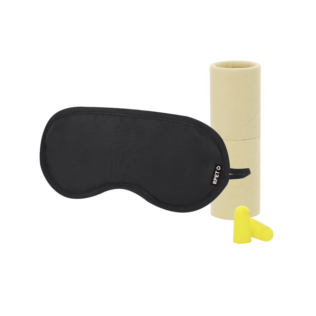 Set de viaje con antifaz y tapones para oídos. Antifaz en suave y confortable RPET con elástico de ajuste a juego, con distintivo en etiqueta. Tapones en confortable material EVA de color amarillo. Presentado en práctico estuche cilíndrico en cartón kraft. El material RPET se elabora a partir de plástico reciclado, para así fomentar la reutilización de residuos plásticos y ayudar a la sostenibilidad del planeta. 2 Accesorios