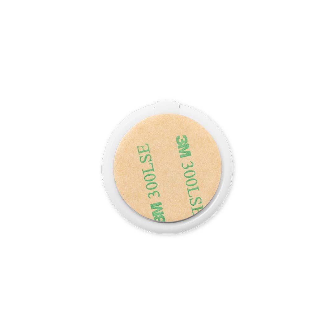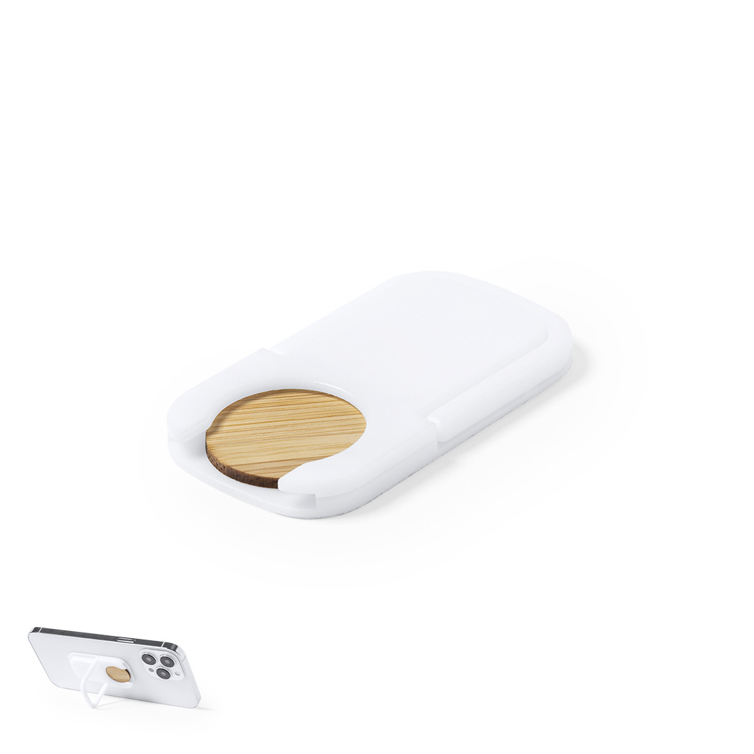 Soporte multifunción para smartphone, con moneda para carro de la compra integrada y anilla/soporte plegable. Cuerpo fabricado en resistente ABS de acabado blanco, con moneda en bambú. Con adhesivo de fijación extra fuerte y libre de residuos al despegarlo del dispositivo. Adhesivo. 3 Funciones