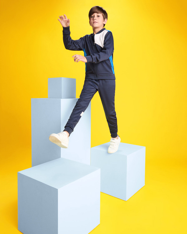 Chaqueta deportiva con cremallera frontal perchada. Bolsillos laterales con cremallera. Piezas a contraste de color, una blanca en pecho especial para bordados. Cuello, puños y cintura en canalé de 1x1.