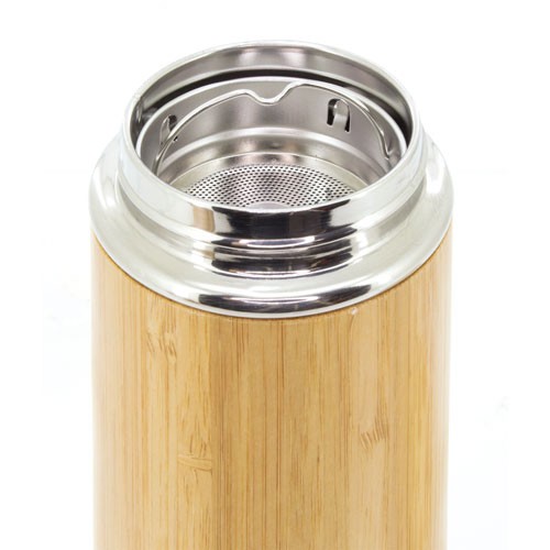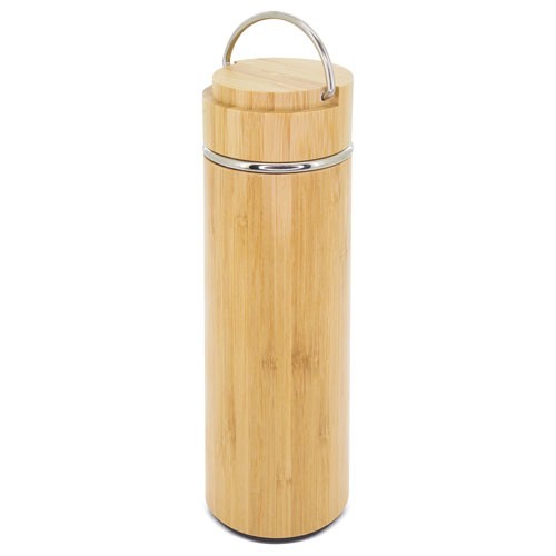 Realizado en bambú con doble cámara para mejor conservación, asa para transporte plegable e infusar.Capacidad 400 ml