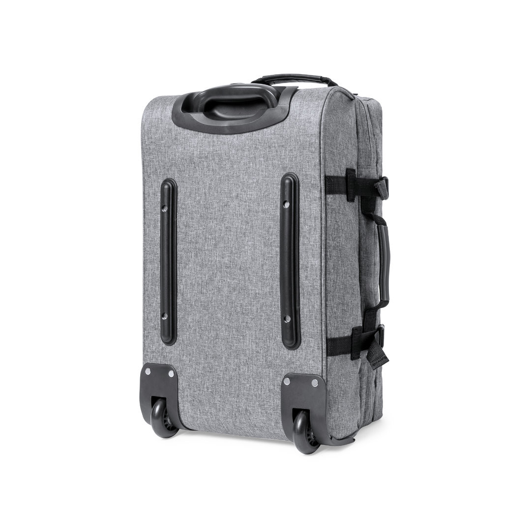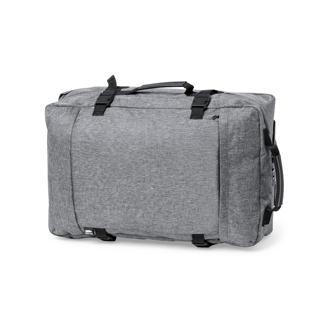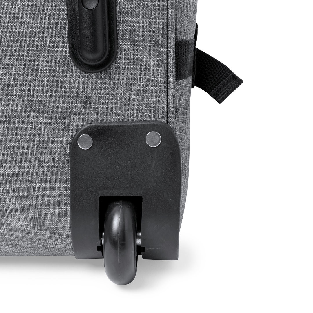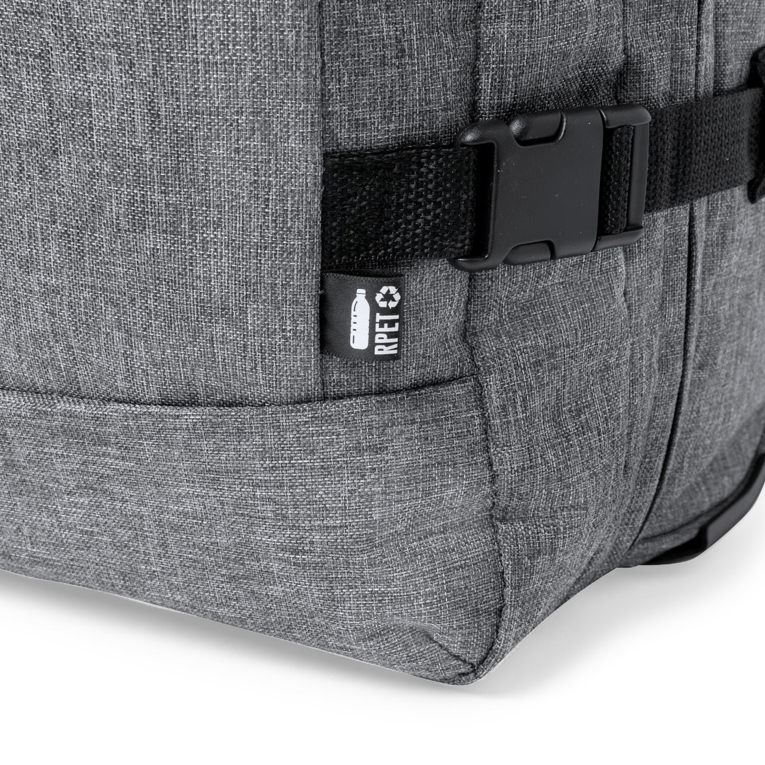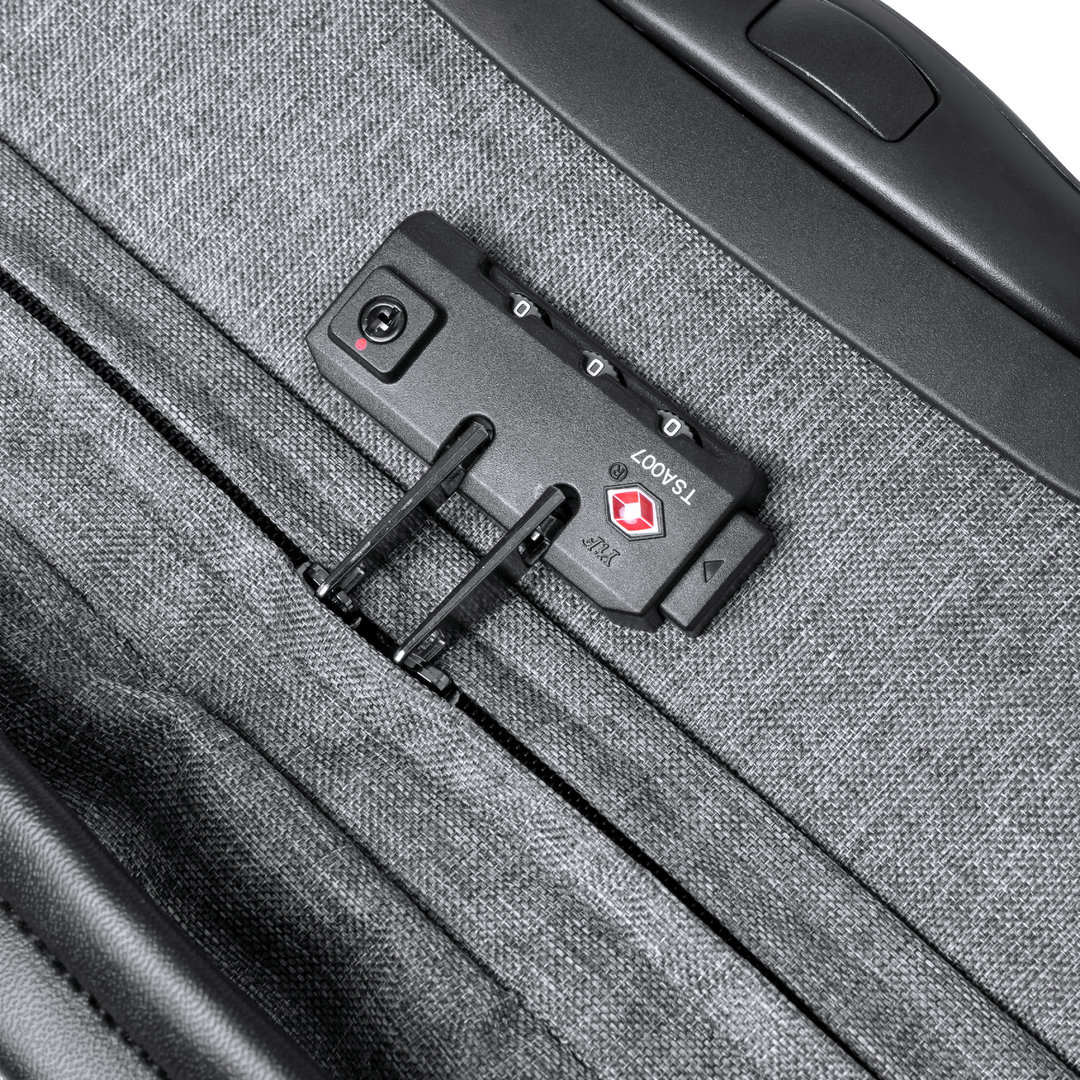 Trolley de línea nature fabricado en resistente 300D RPET. Compartimento principal con cierre de cremallera de doble tirador conforme a los estándares TSA -Administración de la Seguridad en el Transporte-, que permite a las autoridades de aduanas inspeccionar el contenido del equipaje sin tener que forzar o romper el cierre, usando una llave especial a disposición de la autoridad. Interior forrado y con cintas elásticas de sujeción. Exterior con 2 cintas ajustables, cierres de hebilla, bolsillo frontal con cierre de cremallera invisible y 2 asas acolchadas de transporte. Mecanismo extensible metálico en negro, con cómoda asa de transporte y 2 ruedas. Distintivo RPET en etiqueta exterior. Cierre Seguridad TSA